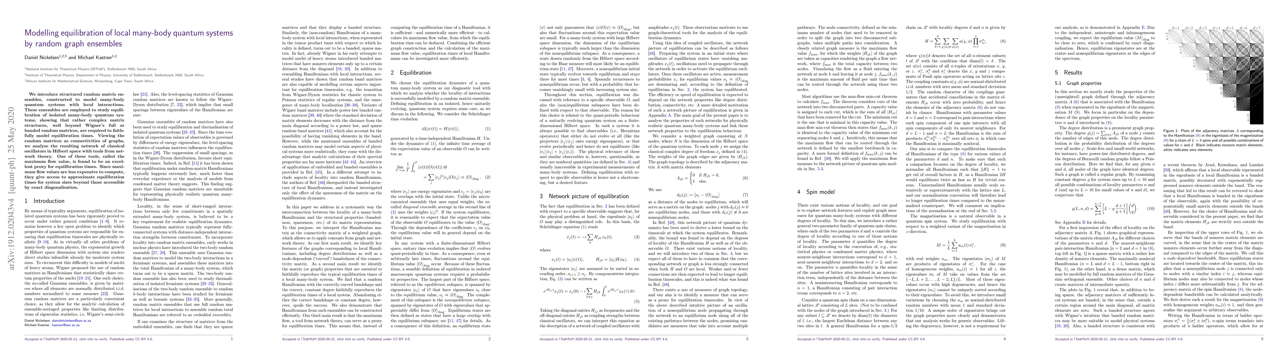 This paper introduces structured random matrix ensembles to model equilibration in many-body quantum systems with local interactions. It finds that complex matrix structures beyond standard random matrices are needed for accurate equilibration time modelling, and uses network theory to analyze the resulting classical oscillator network, identifying the maximum flow value as a cost-effective proxy for equilibration times.