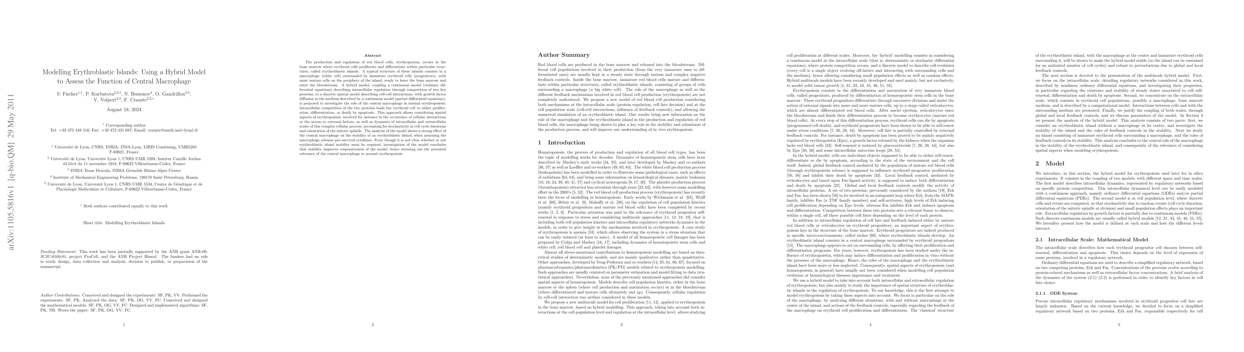 This paper proposes a hybrid model combining continuous and discrete spatial models to investigate the role of central macrophages in erythropoiesis within erythroblastic islands. The analysis reveals that the central macrophage's release of pro-survival cytokines significantly stabilizes the island, enhancing the process's responsiveness and underscoring the macrophage's potential importance in normal erythropoiesis.