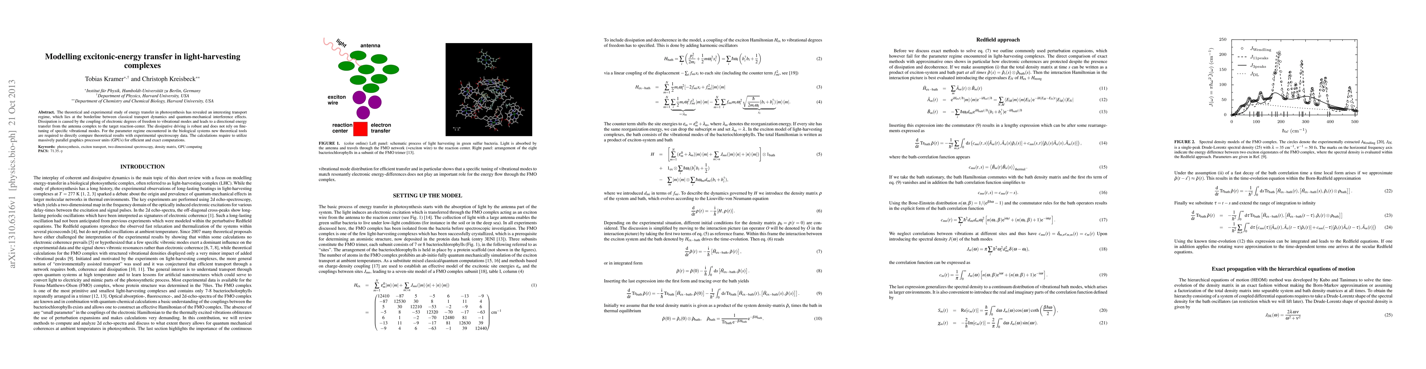 The theoretical and experimental study of energy transfer in photosynthesis has revealed an interesting transport regime, which lies at the borderline between classical transport dynamics and quantum-mechanical interference effects. Dissipation is caused by the coupling of electronic degrees of freedom to vibrational modes and leads to a directional energy transfer from the antenna complex to the target reaction-center. The dissipative driving is robust and does not rely on fine-tuning of specific vibrational modes. For the parameter regime encountered in the biological systems new theoretical tools are required to directly compare theoretical results with experimental spectroscopy data. The calculations require to utilize massively parallel graphics processor units (GPUs) for efficient and exact computations.