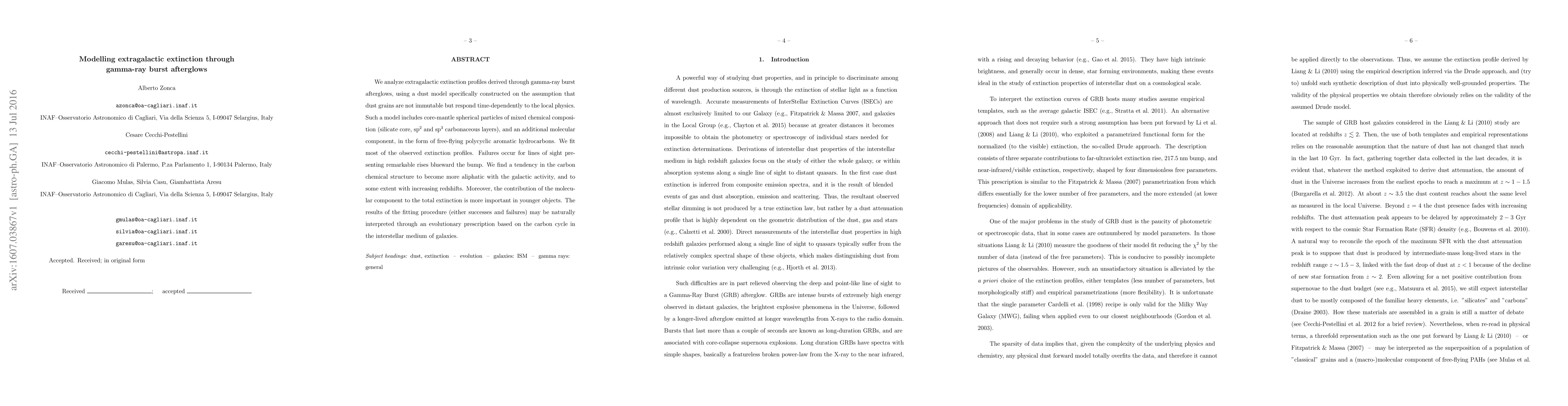 We analyze extragalactic extinction profiles derived through gamma-ray burst afterglows, using a dust model specifically constructed on the assumption that dust grains are not immutable but respond time-dependently to the local physics. Such a model includes core-mantle spherical particles of mixed chemical composition (silicate core, sp2 and sp3 carbonaceous layers), and an additional molecular component, in the form of free-flying polycyclic aromatic hydrocarbons. We fit most of the observed extinction profiles. Failures occur for lines of sight presenting remarkable rises blueward the bump. We find a tendency in the carbon chemical structure to become more aliphatic with the galactic activity, and to some extent with increasing redshifts. Moreover, the contribution of the moleclar component to the total extinction is more important in younger objects. The results of the fitting procedure (either successes and failures) may be naturally interpreted through an evolutionary prescription based on the carbon cycle in the interstellar medium of galaxies.