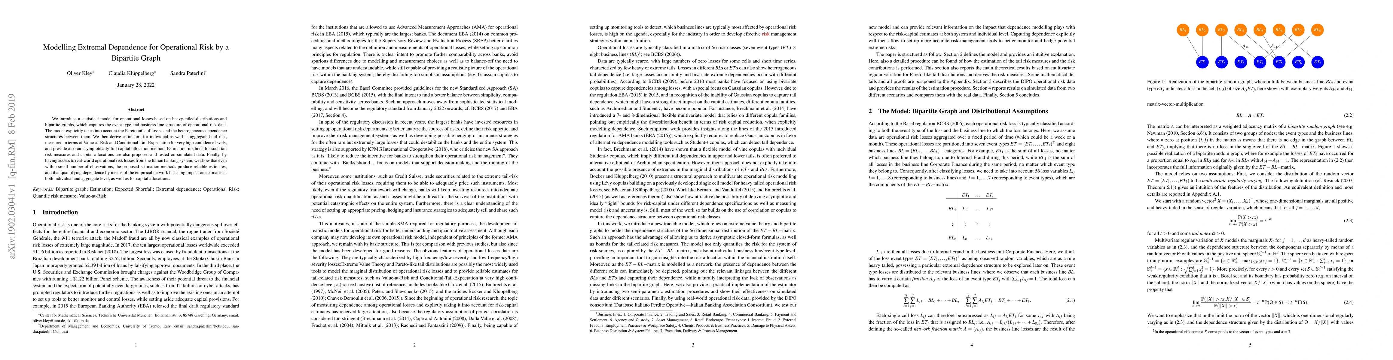 This paper proposes a statistical model for operational risk losses using heavy-tailed distributions and bipartite graphs to capture event types and business line structures. It provides estimators for tail risk measures and capital allocations, demonstrating reliable estimates and significant improvements in dependence quantification through empirical network analysis on Italian banking data.