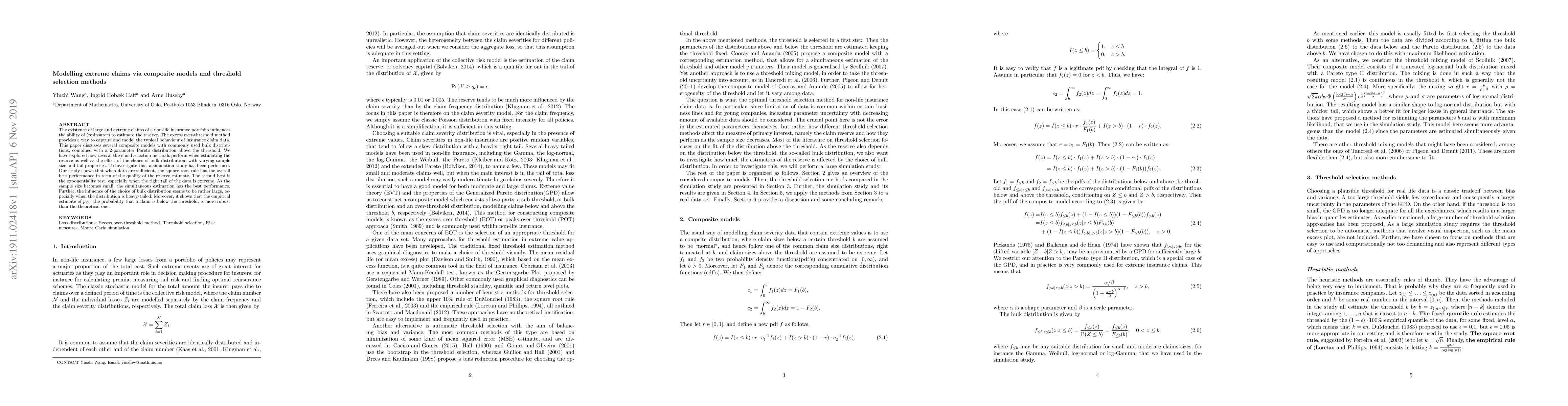 This paper explores composite models combining bulk distributions with a Pareto distribution to model extreme claims in non-life insurance. It finds that the square root rule is most effective for reserve estimation when sufficient data is available, while the exponentiality test performs well for extreme right tails.
