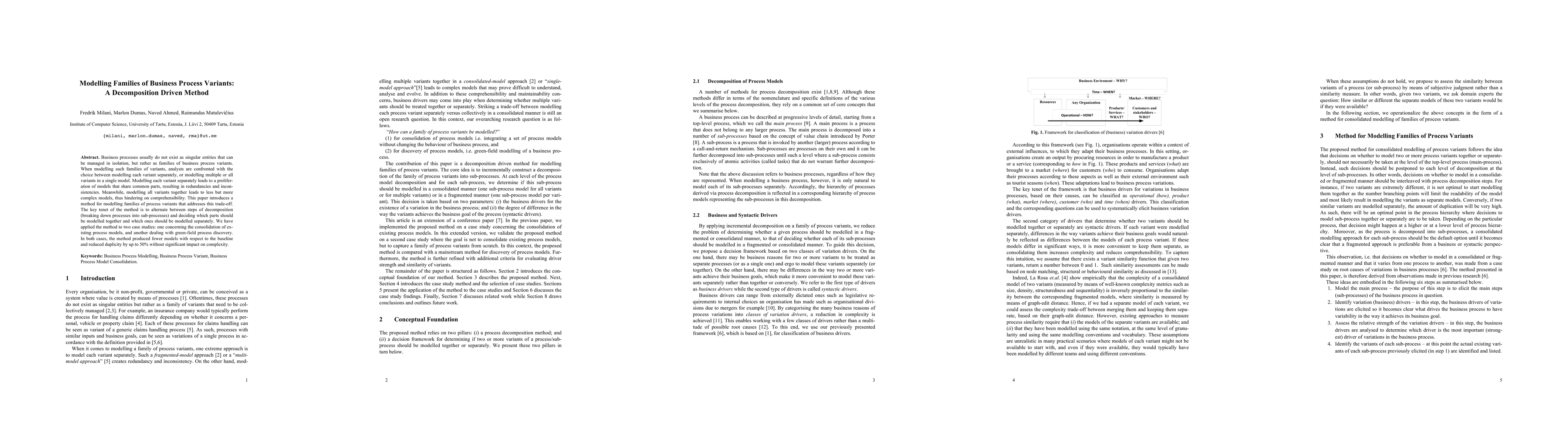 Business processes usually do not exist as singular entities that can be managed in isolation, but rather as families of business process variants. When modelling such families of variants, analysts are confronted with the choice between modelling each variant separately, or modelling multiple or all variants in a single model. Modelling each variant separately leads to a proliferation of models that share common parts, resulting in redundancies and inconsistencies. Meanwhile, modelling all variants together leads to less but more complex models, thus hindering on comprehensibility. This paper introduces a method for modelling families of process variants that addresses this trade-off. The key tenet of the method is to alternate between steps of decomposition (breaking down processes into sub-processes) and deciding which parts should be modelled together and which ones should be modelled separately. We have applied the method to two case studies: one concerning the consolidation of ex-isting process models, and another dealing with green-field process discovery. In both cases, the method produced fewer models with respect to the baseline and reduced duplicity by up to 50% without significant impact on complexity.