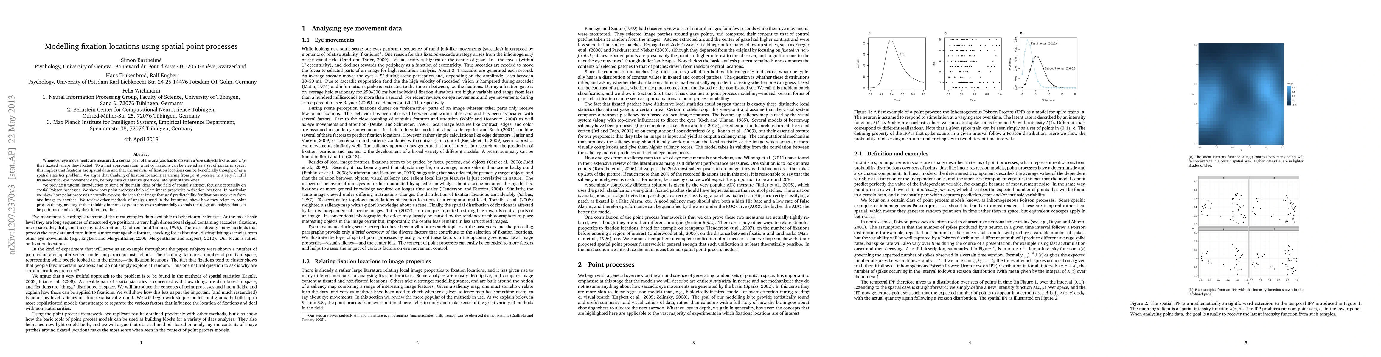 The paper presents a tutorial introduction to spatial point processes and their application in modeling fixation locations, proposing a Bayesian approach for estimating intensity functions using Gaussian processes and addressing dependencies on the first fixation.