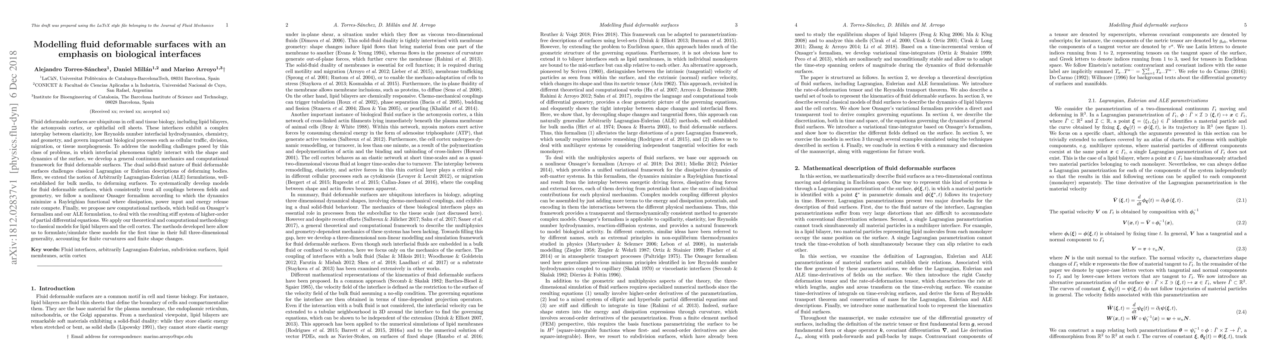 This paper develops a continuum mechanics framework and computational methods for modelling fluid deformable surfaces, focusing on biological interfaces like lipid bilayers and the actomysin cortex. It extends the Arbitrarily Lagrangian-Eulerian (ALE) formulation to deforming surfaces and uses a nonlinear Onsager formalism to treat couplings between geometry and dynamics, enabling the simulation of these interfaces in three dimensions.
