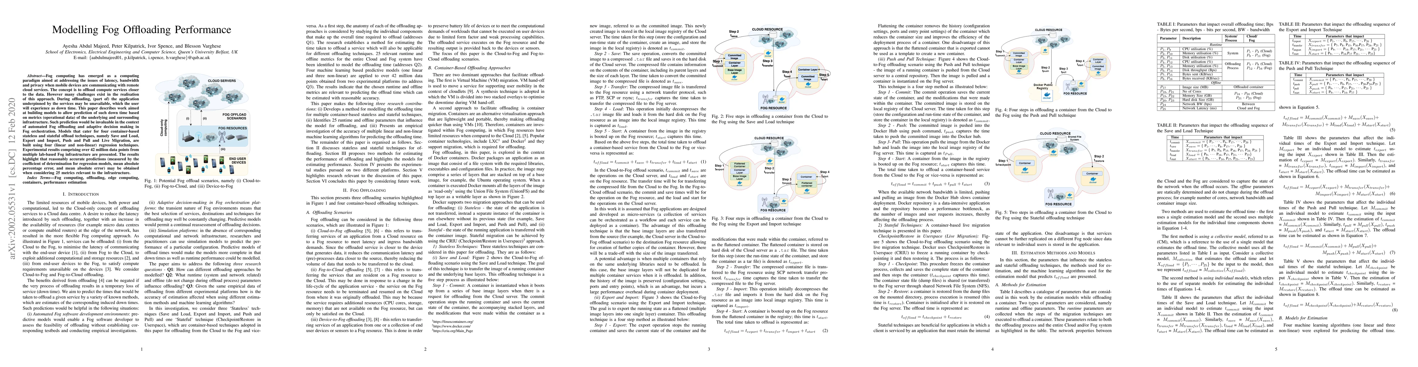 Fog computing has emerged as a computing paradigm aimed at addressing the issues of latency, bandwidth and privacy when mobile devices are communicating with remote cloud services. The concept is to offload compute services closer to the data. However many challenges exist in the realisation of this approach. During offloading, (part of) the application underpinned by the services may be unavailable, which the user will experience as down time. This paper describes work aimed at building models to allow prediction of such down time based on metrics (operational data) of the underlying and surrounding infrastructure. Such prediction would be invaluable in the context of automated Fog offloading and adaptive decision making in Fog orchestration. Models that cater for four container-based stateless and stateful offload techniques, namely Save and Load, Export and Import, Push and Pull and Live Migration, are built using four (linear and non-linear) regression techniques. Experimental results comprising over 42 million data points from multiple lab-based Fog infrastructure are presented. The results highlight that reasonably accurate predictions (measured by the coefficient of determination for regression models, mean absolute percentage error, and mean absolute error) may be obtained when considering 25 metrics relevant to the infrastructure.