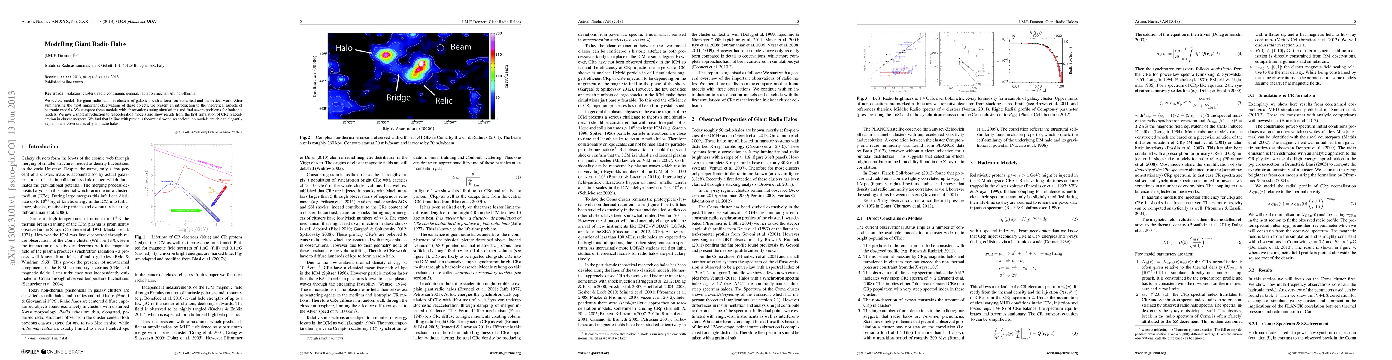 We review models for giant radio halos in clusters of galaxies, with a focus on numerical and theoretical work. After summarising the most important observations of these objects, we present an introduction to the theoretical aspects of hadronic models. We compare these models with observations using simulations and find severe problems for hadronic models. We give a short introduction to reacceleration models and show results from the first simulation of CRe reaccel- eration in cluster mergers. We find that in-line with previous theoretical work, reacceleration models are able to elegantly explain main observables of giant radio halos.