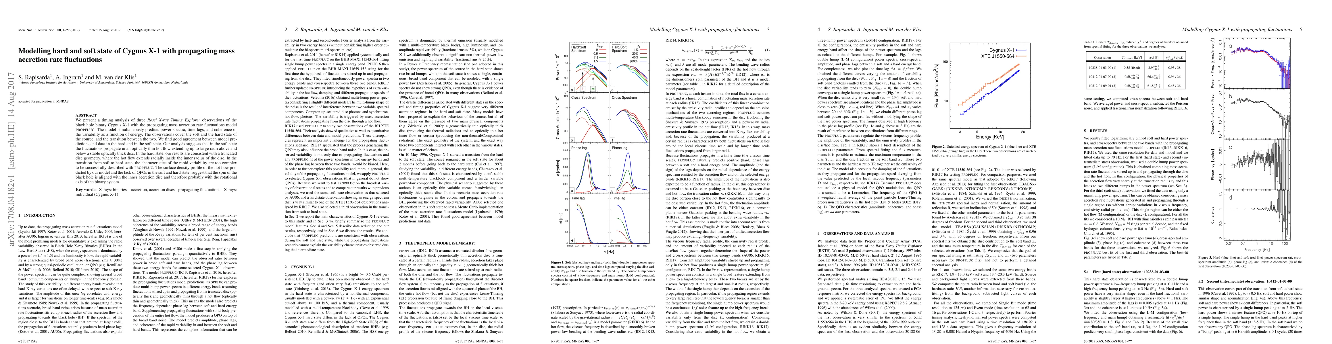 We present a timing analysis of threeRossi X-ray Timing Explorer observations of the black hole binary Cygnus X-1 with the propagating mass accretion rate fluctuations model PROPFLUC. The model simultaneously predicts power spectra, time lags, and coherence of the variability as a function of energy. The observations cover the soft and the hard state of the source, and the transition between the two. We find good agreement between model pre-dictions and data in the hard and in the soft state. Our analysis suggests that in the soft state the fluctuations propagate in an optically thin hot flow extending up to large radii above and below a stable optically thick disc. In the hard state, our results are consistent with a truncated disc geometry, where the hot flow extends radially inside the inner radius of the disc. In the transition from soft to hard state, the characteristics of the rapid variability are too complex to be successfully described with PROPFLUC. The surface density profile of the hot flow predicted by our model and the lack of QPOs in the soft and hard state, suggest that the spin of the black hole is aligned with the inner accretion disc and therefore probably with the rotational axis of the binary system.