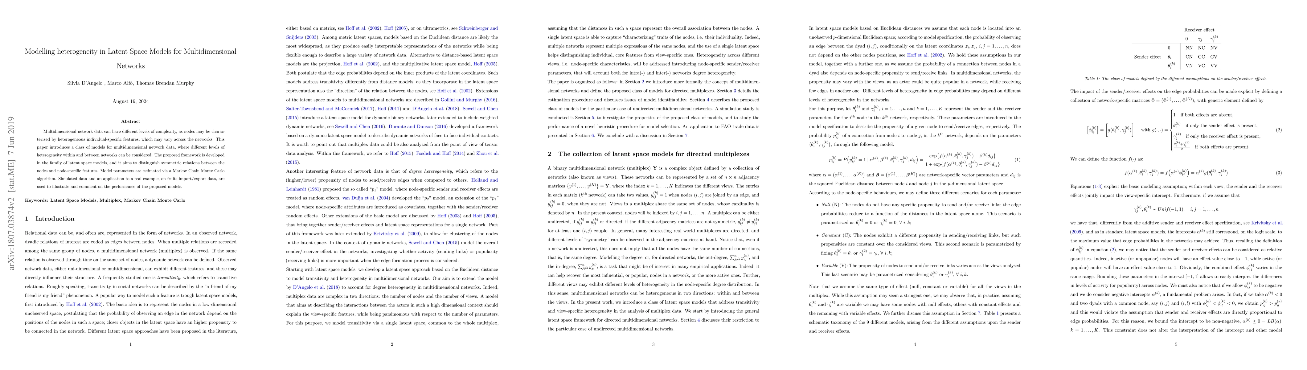 The paper presents a novel class of latent space models for multidimensional networks that can handle varying levels of heterogeneity, along with an efficient MCMC algorithm for parameter estimation and a heuristic model selection procedure.