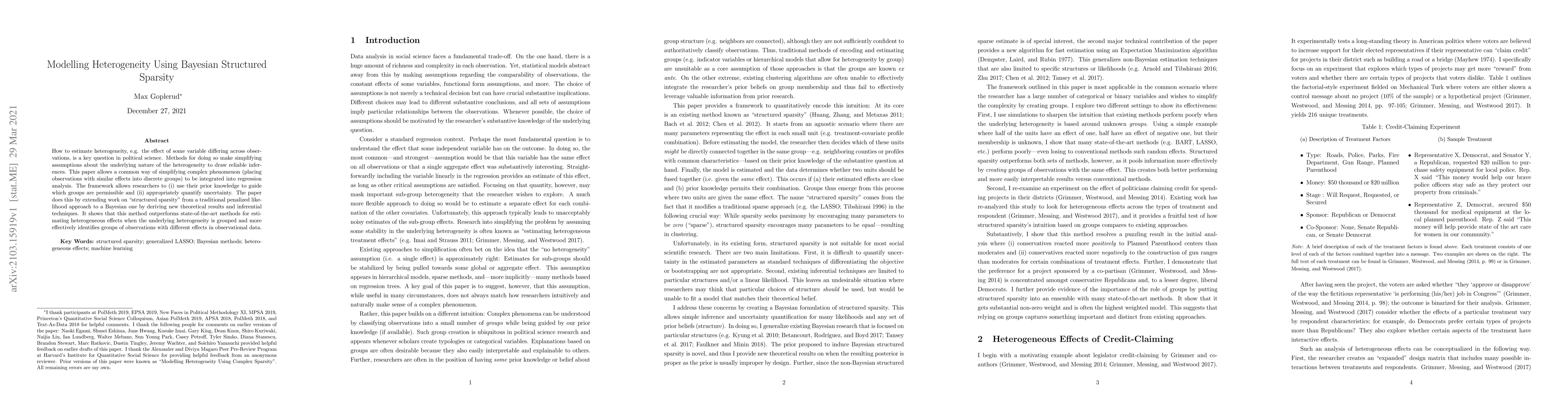 This paper proposes a Bayesian structured sparsity framework to model heterogeneity in political science, allowing researchers to incorporate prior knowledge and quantify uncertainty. It outperforms traditional methods by effectively identifying groups of observations with different effects in observational data.
