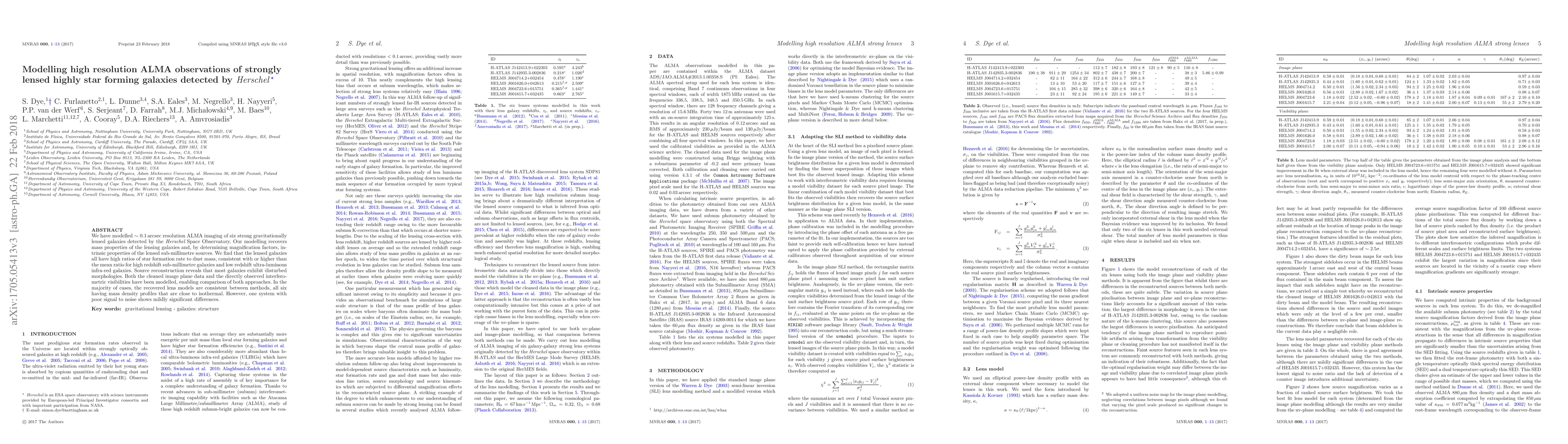 This paper models high-resolution ALMA observations of six strongly lensed, star-forming galaxies detected by Herschel, revealing high star formation rates relative to dust mass and disturbed galaxy morphologies. The study compares lens models derived from cleaned image plane data and interferometric visibilities, finding consistent results for most galaxies.