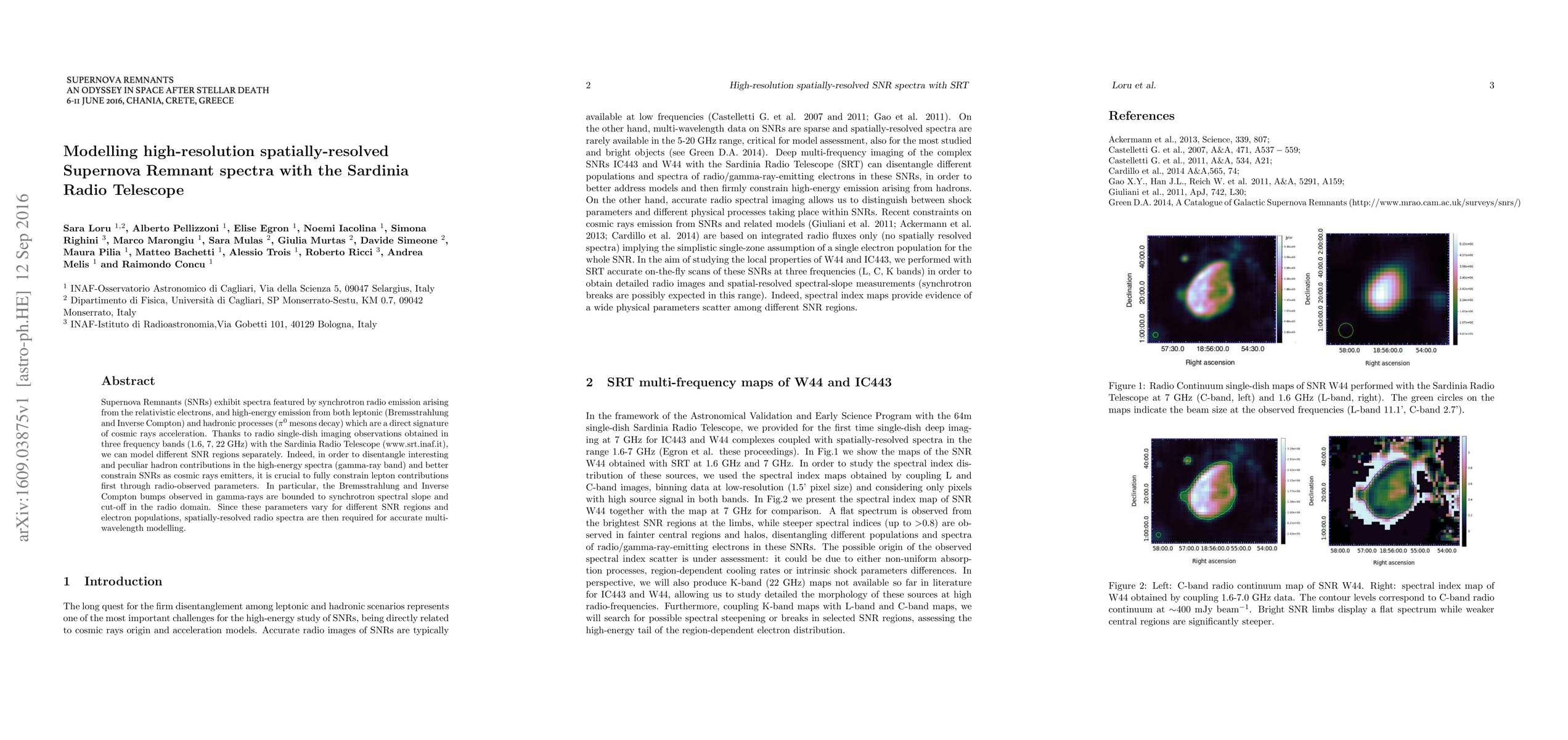 This paper models high-resolution spatially-resolved spectra of Supernova Remnants (SNRs) using the Sardinia Radio Telescope, focusing on synchrotron and high-energy emissions to better understand cosmic ray acceleration. Radio observations at three frequencies help disentangle leptonic and hadronic contributions, crucial for accurate multi-wavelength modeling.