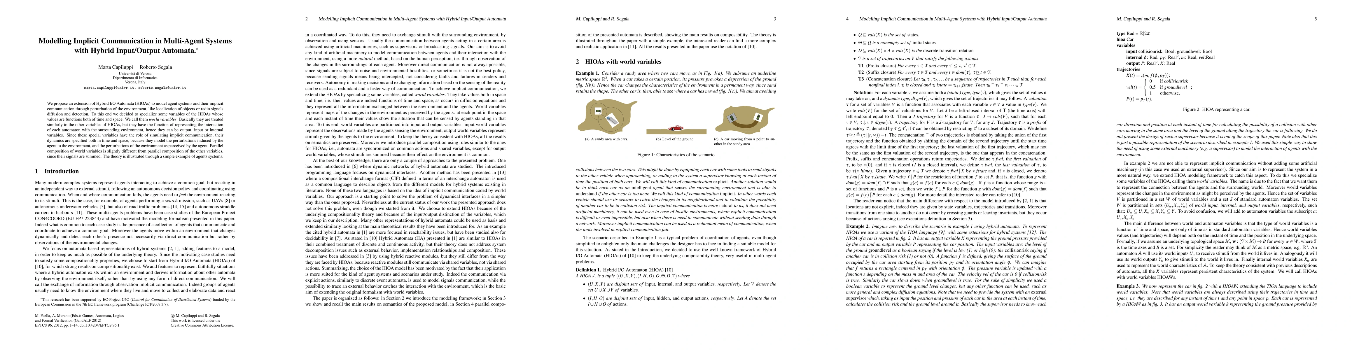 We propose an extension of Hybrid I/O Automata (HIOAs) to model agent systems and their implicit communication through perturbation of the environment, like localization of objects or radio signals diffusion and detection. To this end we decided to specialize some variables of the HIOAs whose values are functions both of time and space. We call them world variables. Basically they are treated similarly to the other variables of HIOAs, but they have the function of representing the interaction of each automaton with the surrounding environment, hence they can be output, input or internal variables. Since these special variables have the role of simulating implicit communication, their dynamics are specified both in time and space, because they model the perturbations induced by the agent to the environment, and the perturbations of the environment as perceived by the agent. Parallel composition of world variables is slightly different from parallel composition of the other variables, since their signals are summed. The theory is illustrated through a simple example of agents systems.