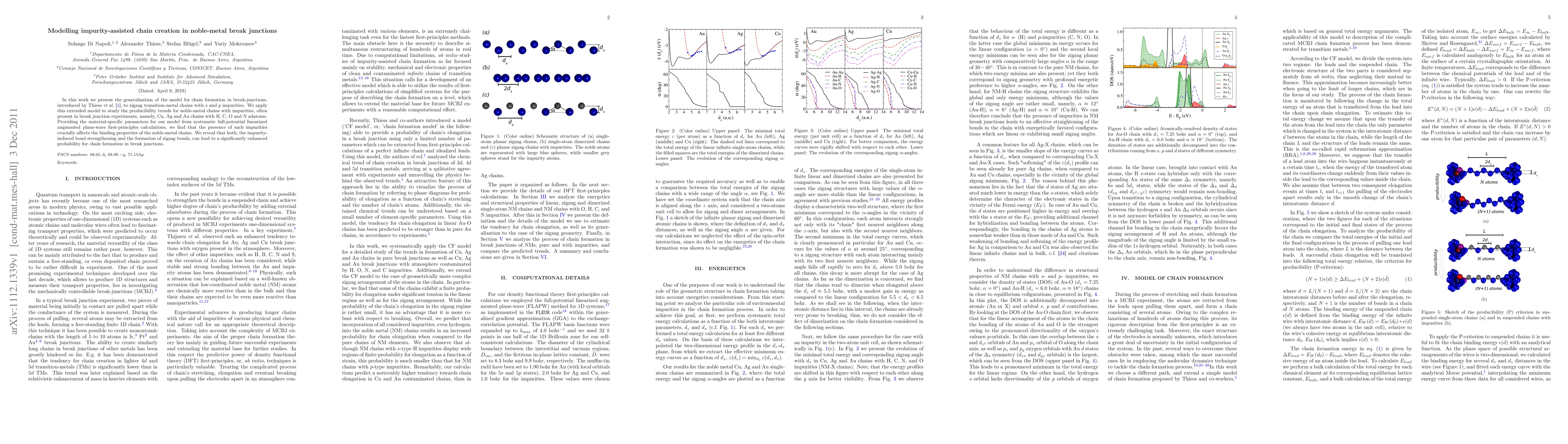 In this work we present the generalization of the model for chain formation in break-junctions, introduced by Thiess {\it et al.} [\onlinecite{Alex08}], to zigzag transition-metal chains with $s$ and $p$ impurities. We apply this extended model to study the producibility trends for noble-metal chains with impurities, often present in break junction experiments, namely, Cu, Ag and Au chains with H, C, O and N adatoms. Providing the material-specific parameters for our model from systematic full-potential linearized augmented plane-wave first-principles calculations, we find that the presence of such impurities crucially affects the binding properties of the noble-metal chains. We reveal that both, the impurity-induced bond strengthening and the formation of zigzag bonds, can lead to a significantly enhanced probability for chain formation in break junctions.