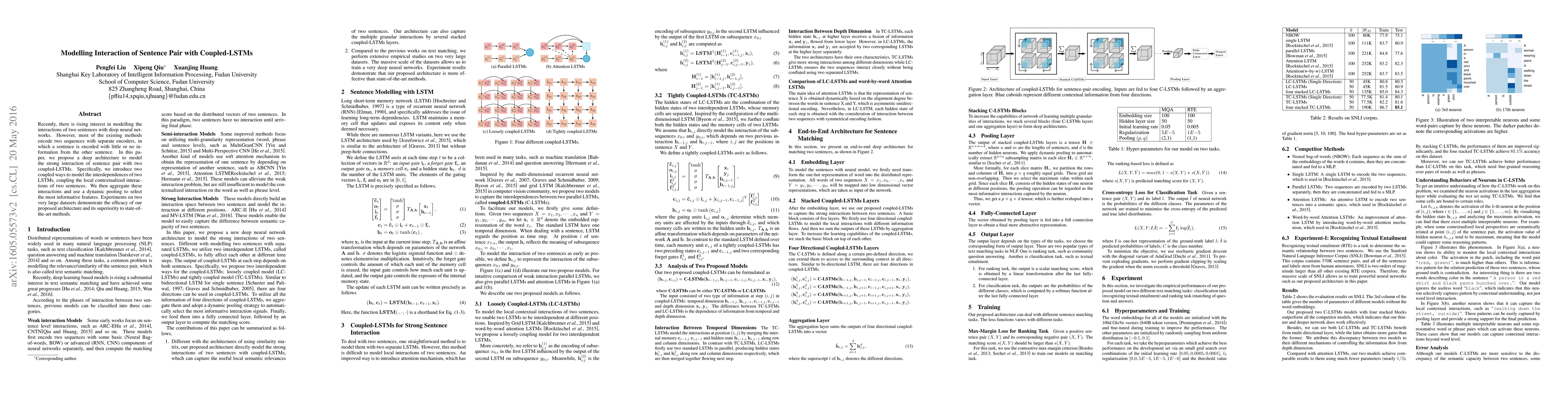 Recently, there is rising interest in modelling the interactions of two sentences with deep neural networks. However, most of the existing methods encode two sequences with separate encoders, in which a sentence is encoded with little or no information from the other sentence. In this paper, we propose a deep architecture to model the strong interaction of sentence pair with two coupled-LSTMs. Specifically, we introduce two coupled ways to model the interdependences of two LSTMs, coupling the local contextualized interactions of two sentences. We then aggregate these interactions and use a dynamic pooling to select the most informative features. Experiments on two very large datasets demonstrate the efficacy of our proposed architecture and its superiority to state-of-the-art methods.