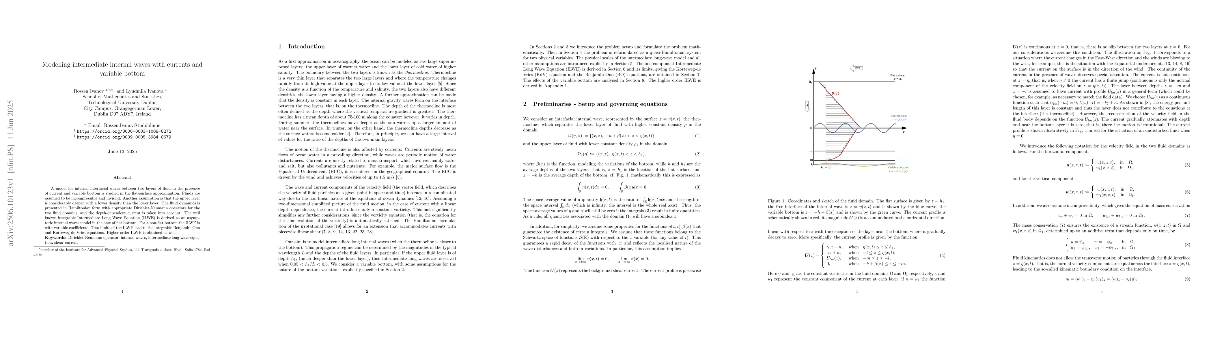 A model for internal interfacial waves between two layers of fluid in the presence of current and variable bottom is studied in the flat-surface approximation. Fluids are assumed to be incompressible and inviscid. Another assumption is that the upper layer is considerably deeper with a lower density than the lower layer. The fluid dynamics is presented in Hamiltonian form with appropriate Dirichlet-Neumann operators for the two fluid domains, and the depth-dependent current is taken into account. The well known integrable Intermediate Long Wave Equation (ILWE) is derived as an asymptotic internal waves model in the case of flat bottom. For a non-flat bottom the ILWE is with variable coefficients. Two limits of the ILWE lead to the integrable Benjamin-Ono and Korteweg-de Vries equations. Higher-order ILWE is obtained as well.