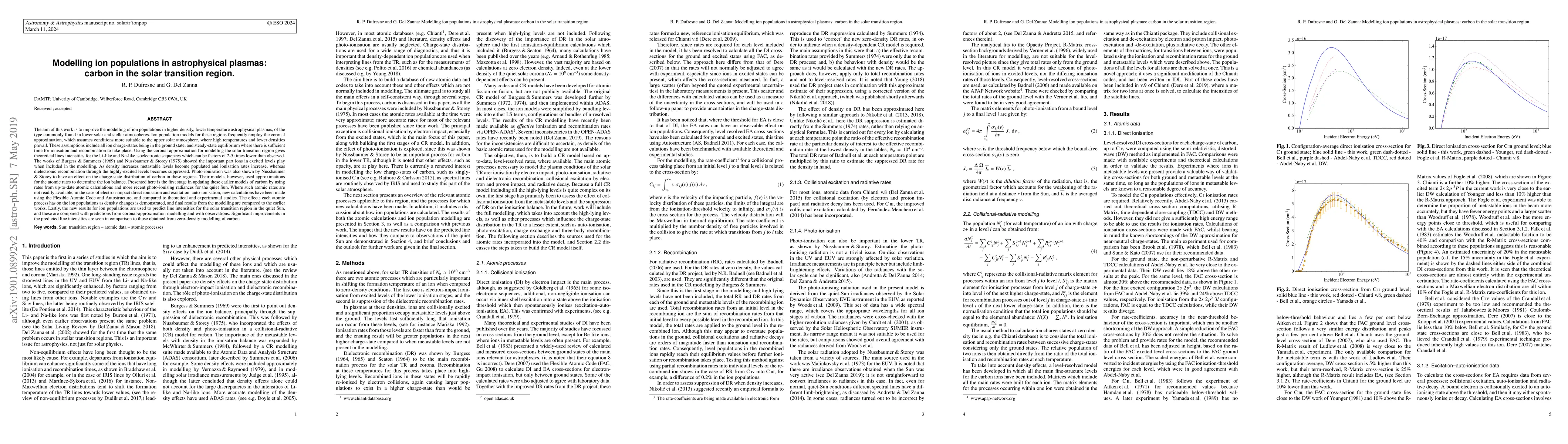 The aim of this work is to improve the modelling of ion populations in higher density, lower temperature astrophysical plasmas, of the type commonly found in lower solar and stellar atmospheres. Ion population models for these regions frequently employ the coronal approximation, which assumes conditions more suitable to the upper solar atmosphere, where high temperatures and lower densities prevail. Using the coronal approximation for modelling the solar transition region gives theoretical lines intensities for the Li-like and Na-like isoelectronic sequences which can be factors of 2-5 times lower than observed. The works of Burgess & Summers (1969) and Nussbaumer & Storey (1975) showed the important part ions in excited levels play when included in the modelling. Their models, however, used approximations for the atomic rates to determine the ion balance. Presented here is the first stage in updating these earlier models of carbon by using rates from up-to-date atomic calculations and more recent photo-ionising radiances for the quiet Sun. Where such atomic rates are not readily available, in the case of electron-impact direct ionisation and excitation--auto-ionisation, new calculations have been made and compared to theoretical and experimental studies. The effects each atomic process has on the ion populations as density changes is demonstrated, and final results from the modelling are compared to the earlier works. Lastly, the new results for ion populations are used to predict line intensities for the solar transition region in the quiet Sun, and these are compared with predictions from coronal-approximation modelling and with observations. Significant improvements in the predicted line intensities are seen in comparison to those obtained from zero-density modelling of carbon.