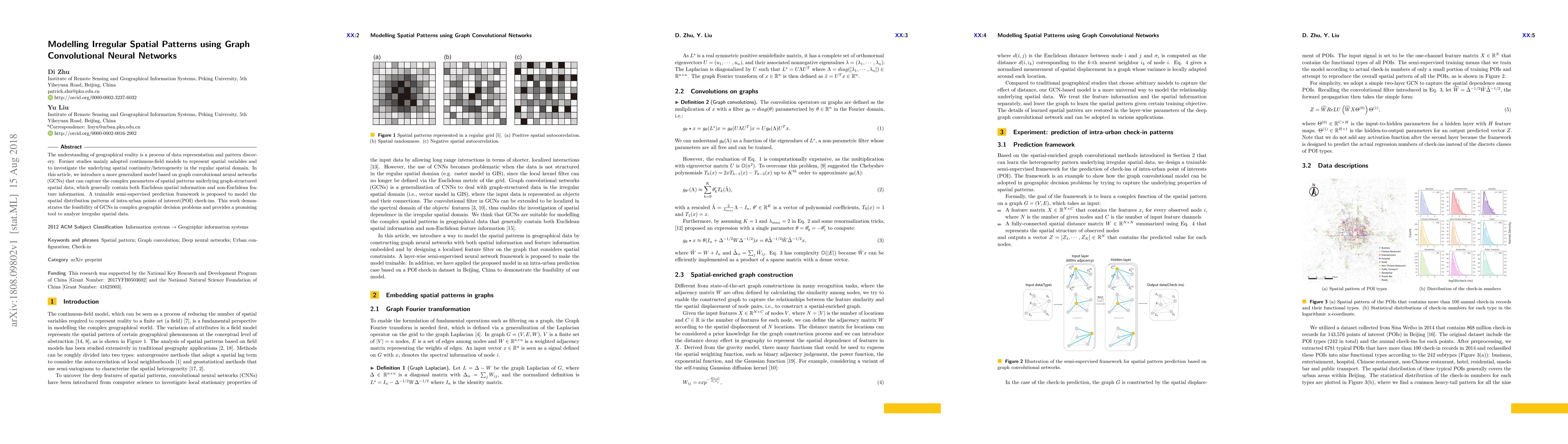 This paper proposes a graph convolutional neural network (GCN) model to capture complex spatial patterns in irregular spatial data, including both Euclidean and non-Euclidean features. The semi-supervised framework is applied to model intra-urban points of interest check-ins, demonstrating GCNs' potential for analyzing complex geographic data.