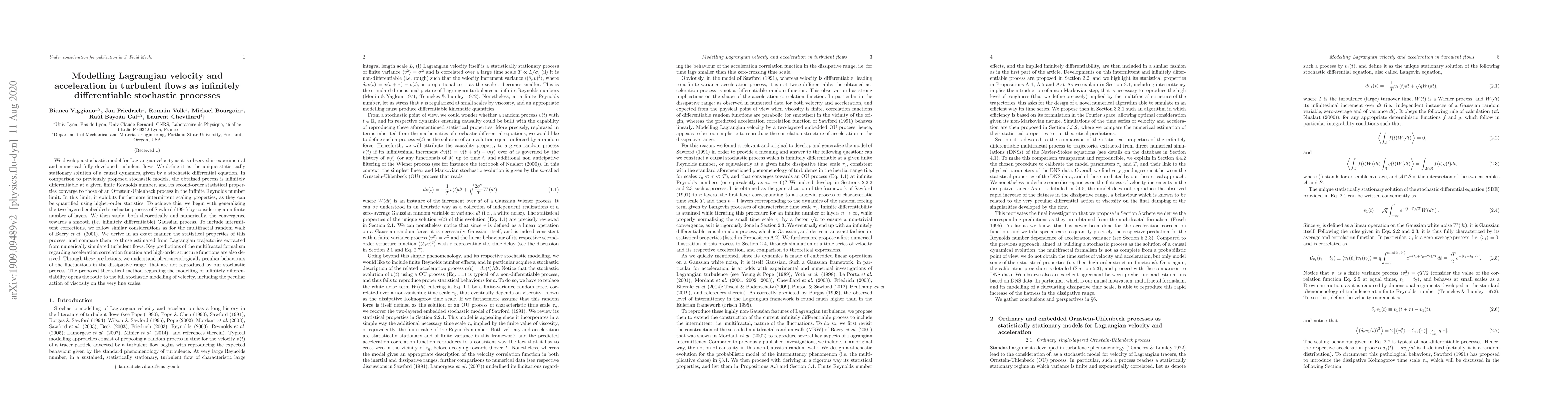 This paper develops a stochastic model for Lagrangian velocity in turbulent flows, defining it as an infinitely differentiable process. The model converges to an Ornstein-Uhlenbeck process at high Reynolds numbers and exhibits intermittent scaling properties, providing insights into the effects of viscosity on fine scales.