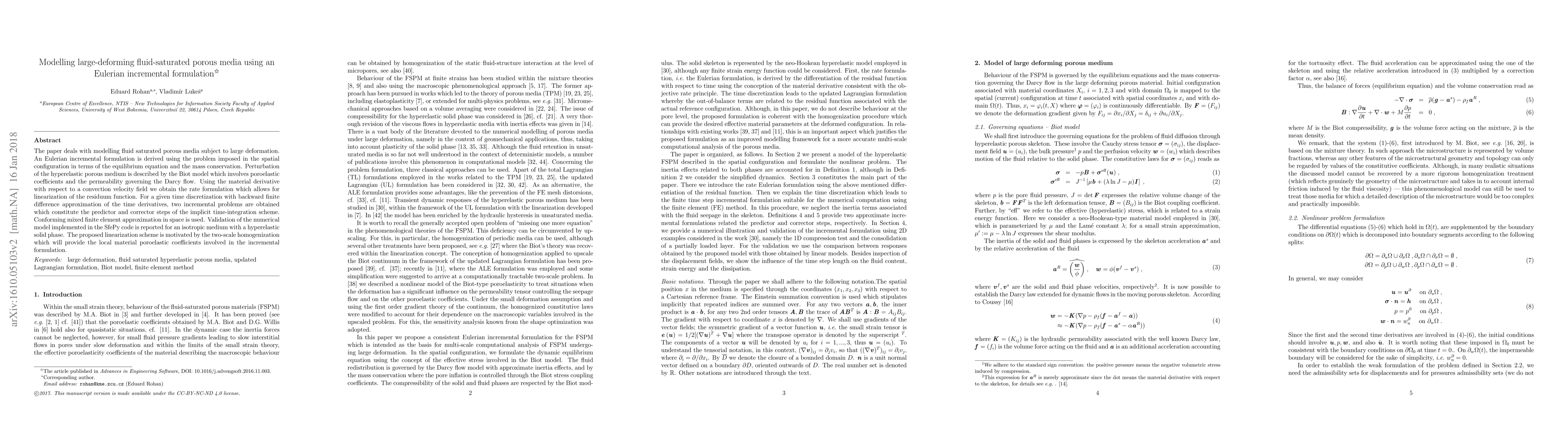 This paper develops an Eulerian incremental formulation for modelling large-deforming fluid-saturated porous media, utilizing the Biot model and a linearization scheme for numerical stability. The model is validated using a conforming mixed finite element method and implemented in the SfePy code.