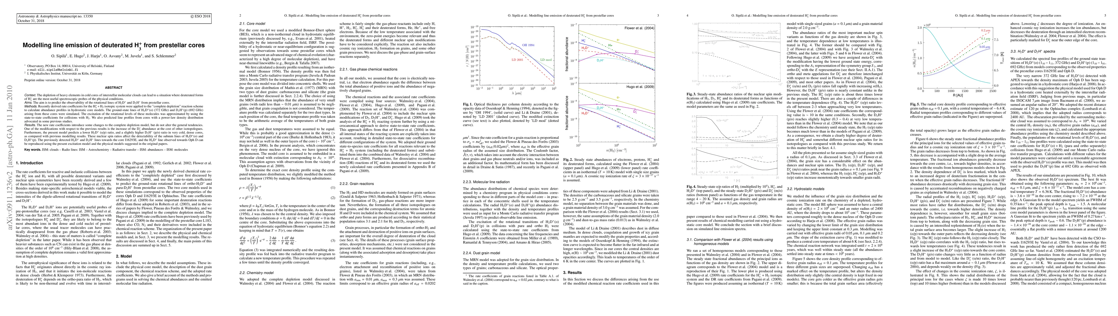 This paper models the emission lines of deuterated H_3^+ from prestellar cores, using updated rate coefficients to predict the observability of H_2D^+ and D_2H^+ lines. The new model shows increased D_3^+ abundance and altered nuclear spin ratios, affecting the detectability of submillimeter lines.