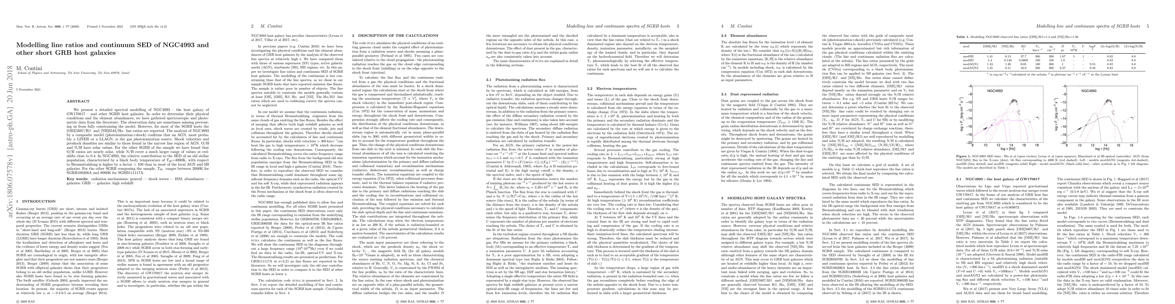 We present a detailed spectral modelling of NGC4993 -- the host galaxy of GW170817 -- and other SGRB host galaxies. In order to determine their physical conditions and the element abundances, we have gathered spectroscopic and photometric data from the literature. The observation data are sometimes missing preventing us from fully constraining the model. However, for most of the SGRB hosts the [OIII]5007/Hb and [NII]6548/Ha line ratios are reported. The analysis of NGC4993 by a composite model (photoionization+shock) confirms that an AGN, most probably a LINER or a LLAGN, is the gas photoionization source. Shock velocities and preshock densities are similar to those found in the narrow line region of AGN. O/H and N/H have solar values. For the other SGRB of the sample we have found that O/H ratios are nearly solar, while N/H cover a much larger range of values at redshifts close to 0.4. In NGC4993, the relative contribution to the SED of an old stellar population, characterized by a black body temperature of Tbb=4000K, with respect to Bremsstrahlung is higher by a factor >100 than in most of the local AGN and SB galaxies. For the other SGRB composing the sample, Tbb ranges between 2000K for SGRB100206A and 8000K for SGRB111117A.