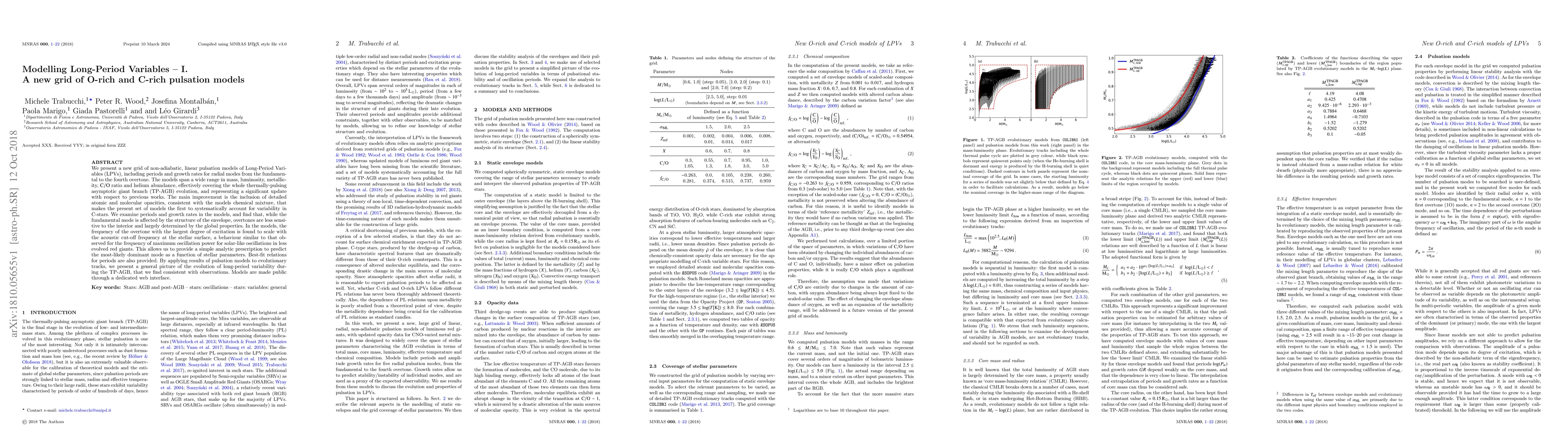 We present a new grid of non-adiabatic, linear pulsation models of Long-Period Variables (LPVs), including periods and growth rates for radial modes from the fundamental to the fourth overtone. The models span a wide range in mass, luminosity, metallicity, C/O ratio and helium abundance, effectively covering the whole thermally-pulsing asymptotic giant branch (TP-AGB) evolution, and representing a significant update with respect to previous works. The main improvement is the inclusion of detailed atomic and molecular opacities, consistent with the models chemical mixture, that makes the present set of models the first to systematically account for variability in C-stars. We examine periods and growth rates in the models, and find that, while the fundamental mode is affected by the structure of the envelope, overtones are less sensitive to the interior and largely determined by the global properties. In the models, the frequency of the overtone with the largest degree of excitation is found to scale with the acoustic cut-off frequency at the stellar surface, a behaviour similar to that observed for the frequency of maximum oscillation power for solar-like oscillations in less evolved red giants. This allows us to provide a simple analytic prescription to predict the most-likely dominant mode as a function of stellar parameters. Best-fit relations for periods are also provided. By applying results of pulsation models to evolutionary tracks, we present a general picture of the evolution of long-period variability during the TP-AGB, that we find consistent with observations. Models are made public through a dedicated web interface.