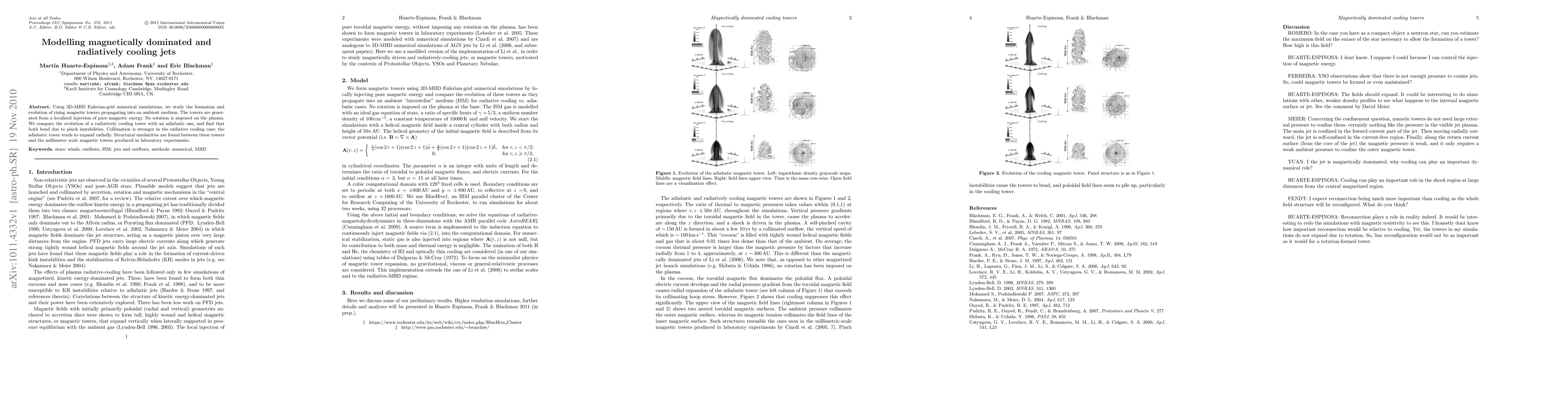 This paper uses 3D-MHD simulations to study magnetically dominated jets, finding that both radiatively cooling and adiabatic towers exhibit pinch instabilities and that cooling enhances collimation. The structural similarities to laboratory experiments suggest broader applicability of the findings.