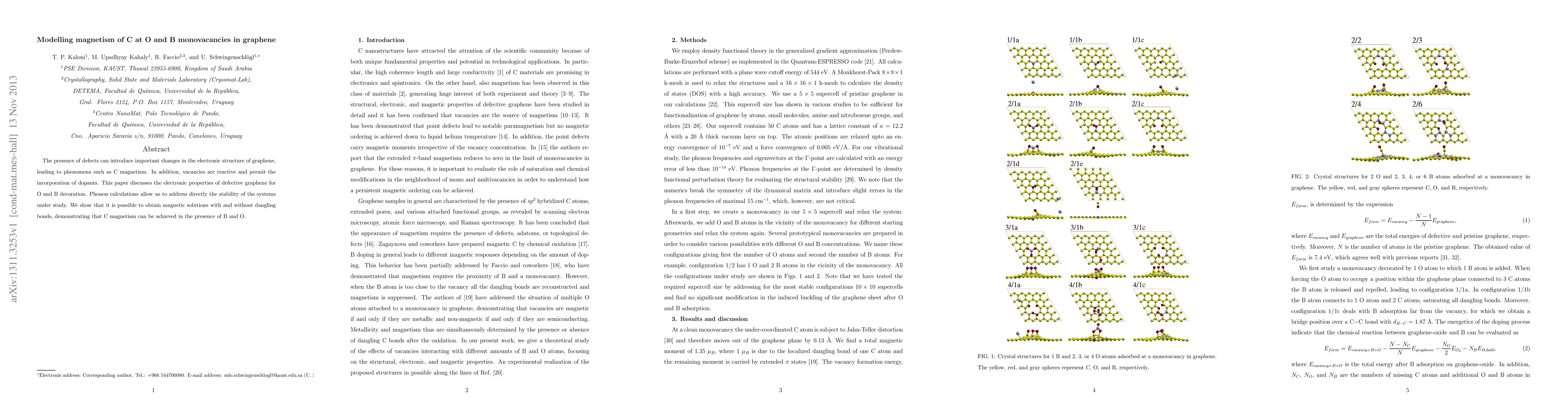 This paper investigates the electronic properties of graphene with C at O and B monovacancies, demonstrating that magnetism can be achieved through these defects, with phonon calculations confirming the stability of the systems. The study reveals that C magnetism is possible even with B and O decorations.