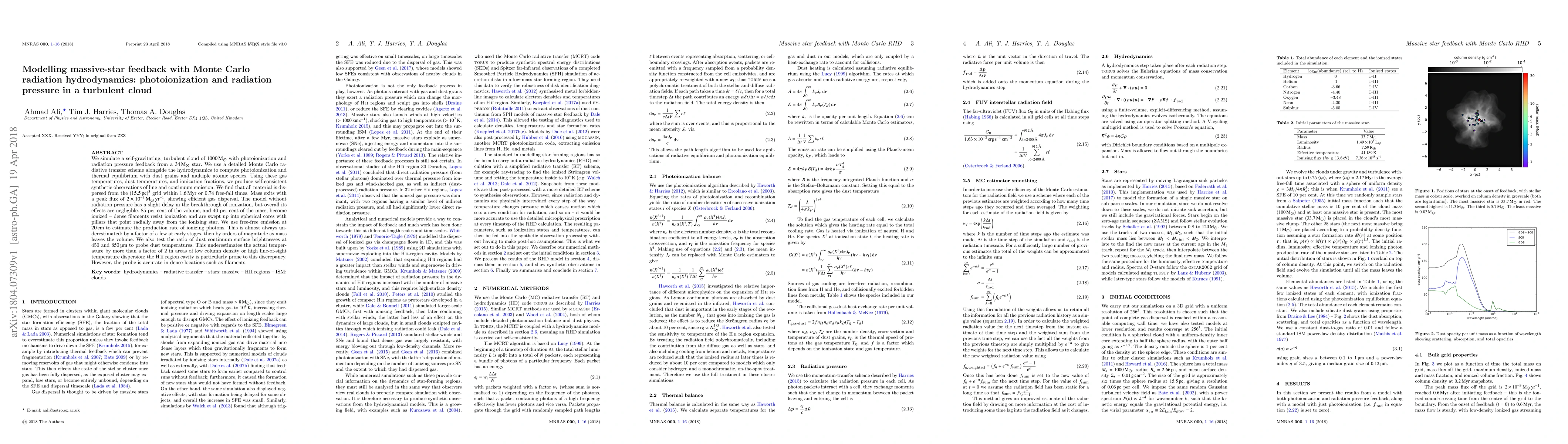 This paper models the feedback from a massive star in a turbulent cloud using Monte Carlo radiation hydrodynamics, finding efficient gas dispersal within 1.6 Myr. The study highlights that radiation pressure has negligible effects compared to photoionization, with 85% of the volume ionized and dense filaments forming pillars.
