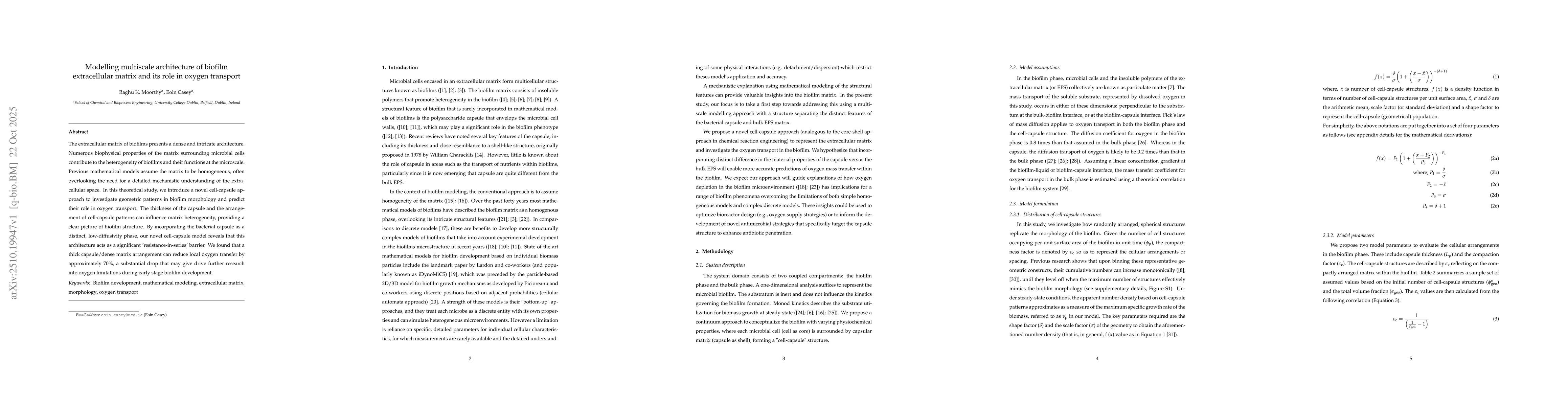 The extracellular matrix of biofilms presents a dense and intricate architecture. Numerous biophysical properties of the matrix surrounding microbial cells contribute to the heterogeneity of biofilms and their functions at the microscale. Previous mathematical models assume the matrix to be homogeneous, often overlooking the need for a detailed mechanistic understanding of the extracellular space. In this theoretical study, we introduce a novel cell-capsule approach to investigate geometric patterns in biofilm morphology and predict their role in oxygen transport. The thickness of the capsule and the arrangement of cell-capsule patterns can influence matrix heterogeneity, providing a clear picture of biofilm structure. By incorporating the bacterial capsule as a distinct, low-diffusivity phase, our novel cell-capsule model reveals that this architecture acts as a significant 'resistance-in-series' barrier. We found that a thick capsule/dense matrix arrangement can reduce local oxygen transfer by approximately 70%, a substantial drop that may give drive further research into oxygen limitations during early stage biofilm development.