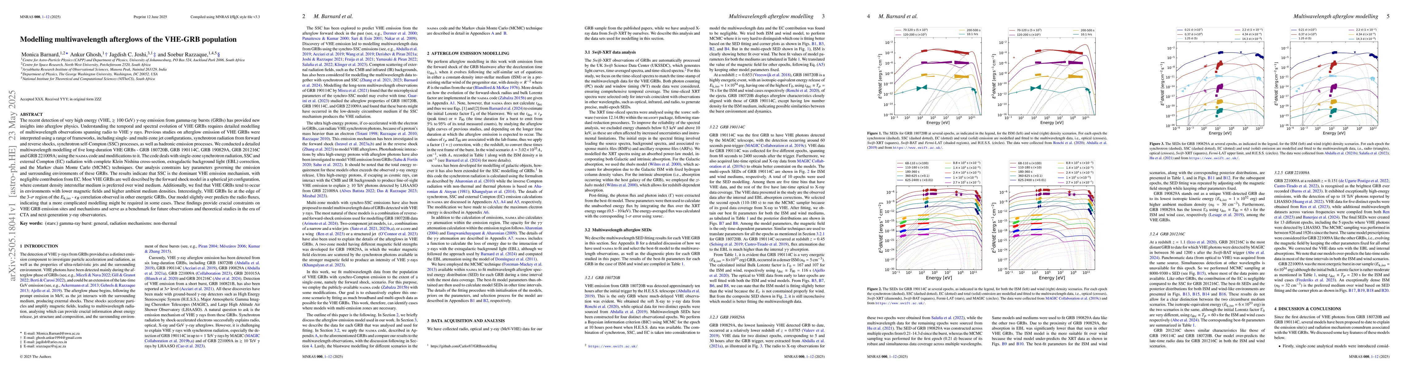 A study models multiwavelength afterglows of VHE-GRBs using a custom code, finding that SSC is the dominant emission mechanism and most GRBs occur in environments with lower magnetic fields and higher ambient medium densities.