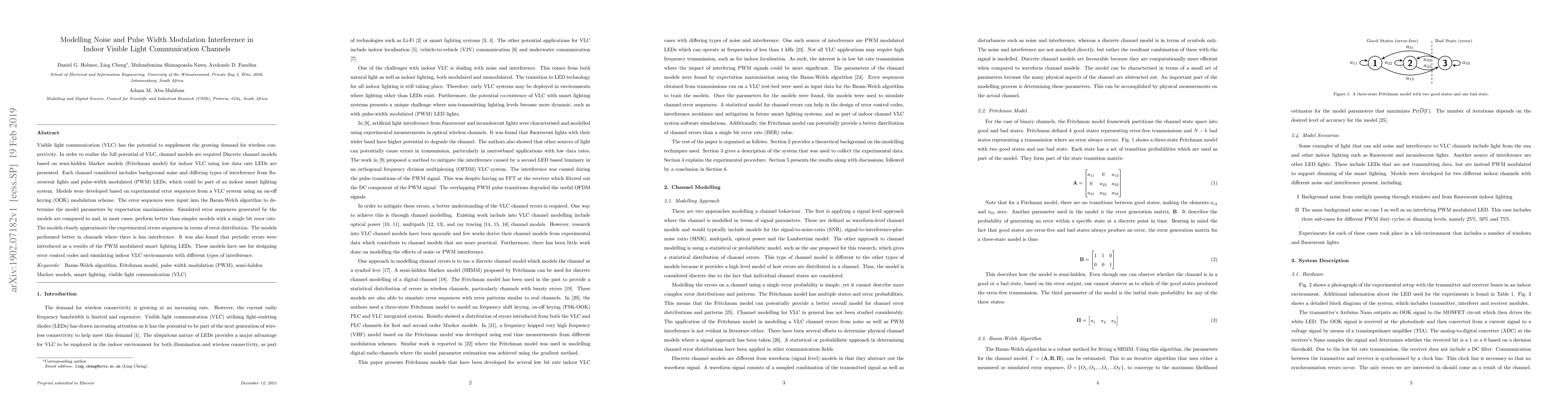 Visible light communication (VLC) has the potential to supplement the growing demand for wireless connectivity. In order to realise the full potential of VLC, channel models are required Discrete channel models based on semi-hidden Markov models (Fritchman model) for indoor VLC using low data rate LEDs are presented. Each channel considered includes background noise and differing types of interference from fluorescent lights and pulse-width modulated (PWM) LEDs, which could be part of an indoor smart lighting system. Models were developed based on experimental error sequences from a VLC system using an on-off keying (OOK) modulation scheme. The error sequences were input into the Baum-Welch algorithm to determine the model parameters by expectation maximisation. Simulated error sequences generated by the models are compared to and, in most cases, perform better than simpler models with a single bit error rate. The models closely approximate the experimental errors sequences in terms of error distribution. The models performed better in channels where there is less interference. It was also found that periodic errors were introduced as a results of the PWM modulated smart lighting LEDs. These models have use for designing error control codes and simulating indoor VLC environments with different types of interference.
