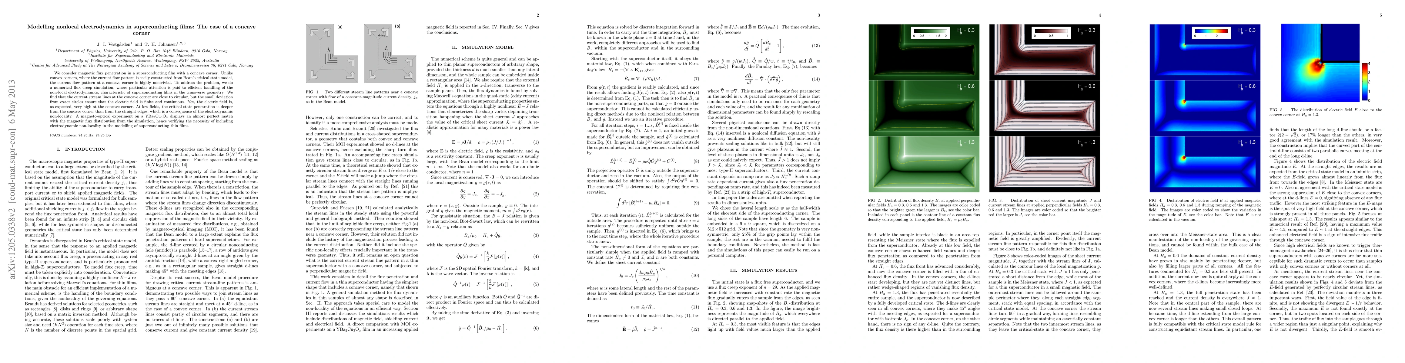 This paper models nonlocal electrodynamics in superconducting films with a concave corner, finding that current streamlines are nearly circular, ensuring finite and continuous electric fields, especially high at the corner. Experimental results from a YBCO sample confirm the necessity of considering non-local effects in such simulations.