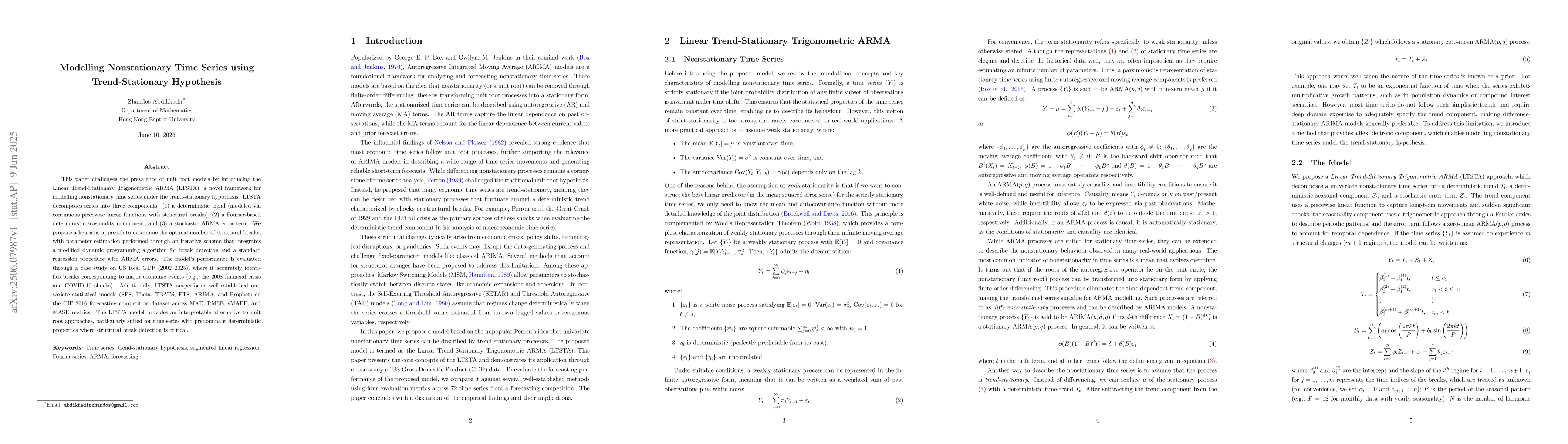 This paper challenges the prevalence of unit root models by introducing the Linear Trend-Stationary Trigonometric ARMA (LTSTA), a novel framework for modelling nonstationary time series under the trend-stationary hypothesis. LTSTA decomposes series into three components: (1) a deterministic trend (modelled via continuous piecewise linear functions with structural breaks), (2) a Fourier-based deterministic seasonality component, and (3) a stochastic ARMA error term. We propose a heuristic approach to determine the optimal number of structural breaks, with parameter estimation performed through an iterative scheme that integrates a modified dynamic programming algorithm for break detection and a standard regression procedure with ARMA errors. The model's performance is evaluated through a case study on US Real GDP (2002-2025), where it accurately identifies breaks corresponding to major economic events (e.g., the 2008 financial crisis and COVID-19 shocks). Additionally, LTSTA outperforms well-established univariate statistical models (SES, Theta, TBATS, ETS, ARIMA, and Prophet) on the CIF 2016 forecasting competition dataset across MAE, RMSE, sMAPE, and MASE metrics. The LTSTA model provides an interpretable alternative to unit root approaches, particularly suited for time series with predominant deterministic properties where structural break detection is critical.