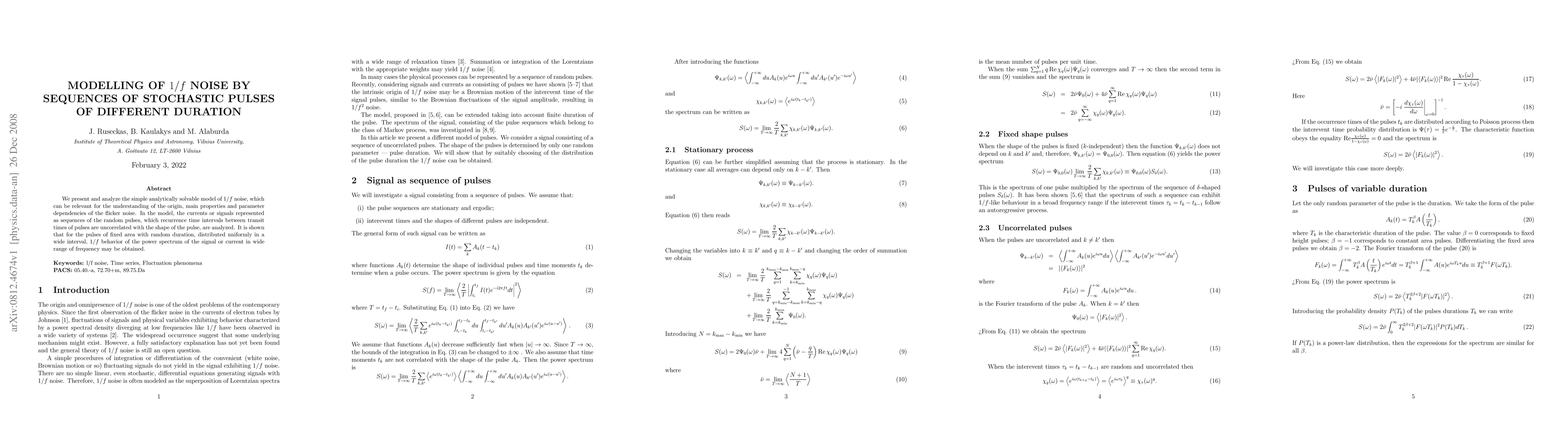 We present and analyze the simple analytically solvable model of 1/f noise, which can be relevant for the understanding of the origin, main properties and parameter dependencies of the flicker noise. In the model, the currents or signals represented as sequences of the random pulses, which recurrence time intervals between transit times of pulses are uncorrelated with the shape of the pulse, are analyzed. It is shown that for the pulses of fixed area with random duration, distributed uniformly in a wide interval, 1/f behavior of the power spectrum of the signal or current in wide range of frequency may be obtained.
