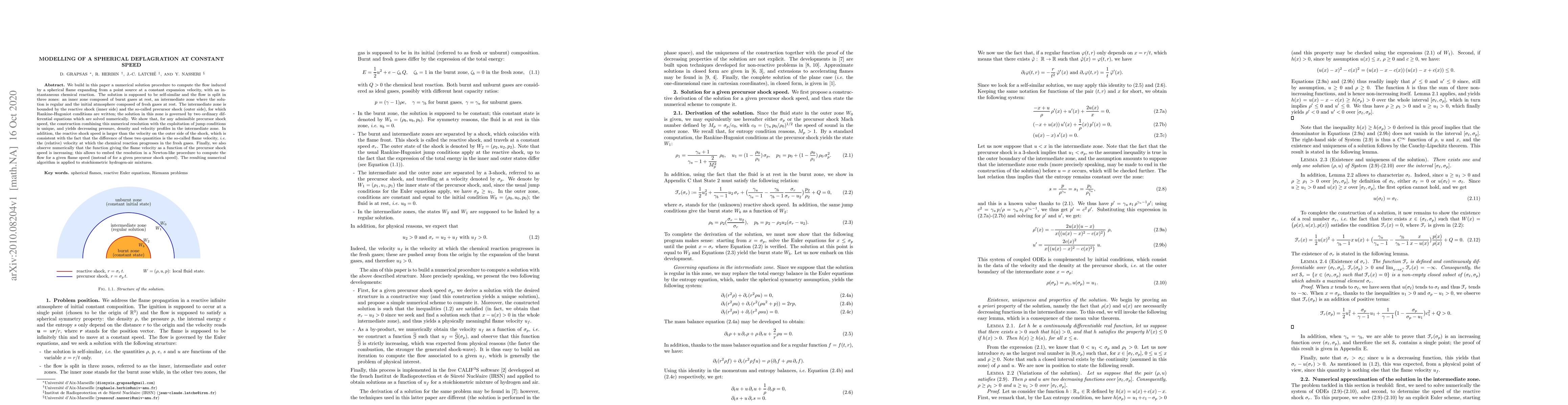 We build in this paper a numerical solution procedure to compute the flow induced by a spherical flame expanding from a point source at a constant expansion velocity, with an instantaneous chemical reaction. The solution is supposed to be self-similar and the flow is split in three zones: an inner zone composed of burnt gases at rest, an intermediate zone where the solution is regular and the initial atmosphere composed of fresh gases at rest. The intermediate zone is bounded by the reactive shock (inner side) and the so-called precursor shock (outer side), for which Rankine-Hugoniot conditions are written; the solution in this zone is governed by two ordinary differential equations which are solved numerically. We show that, for any admissible precursor shock speed, the construction combining this numerical resolution with the exploitation of jump conditions is unique, and yields decreasing pressure, density and velocity profiles in the intermediate zone. In addition, the reactive shock speed is larger than the velocity on the outer side of the shock, which is consistent with the fact that the difference of these two quantities is the so-called flame velocity, i.e. the (relative) velocity at which the chemical reaction progresses in the fresh gases. Finally, we also observe numerically that the function giving the flame velocity as a function of the precursor shock speed is increasing; this allows to embed the resolution in a Newton-like procedure to compute the flow for a given flame speed (instead of for a given precursor shock speed). The resulting numerical algorithm is applied to stoichiometric hydrogen-air mixtures. Key words. spherical flames, reactive Euler equations, Riemann problems burnt zone (constant state) intermediate zone (regular solution) unburnt zone (constant initial state) W b W 2 W 1 W 0 reactive shock, r = $\sigma$ r t. precursor shock, r = $\sigma$ p t. W = ($\rho$, u, p): local fluid state. Fig. 1.1. Structure of the solution. 1. Problem position. We address the flame propagation in a reactive infinite atmosphere of initial constant composition. The ignition is supposed to occur at a single point (chosen to be the origin of R 3) and the flow is supposed to satisfy a spherical symmetry property: the density $\rho$, the pressure p, the internal energy e and the entropy s only depend on the distance r to the origin and the velocity reads u = ur/r, where r stands for the position vector. The flame is supposed to be infinitely thin and to move at a constant speed. The flow is governed by the Euler equations, and we seek a solution with the following structure: