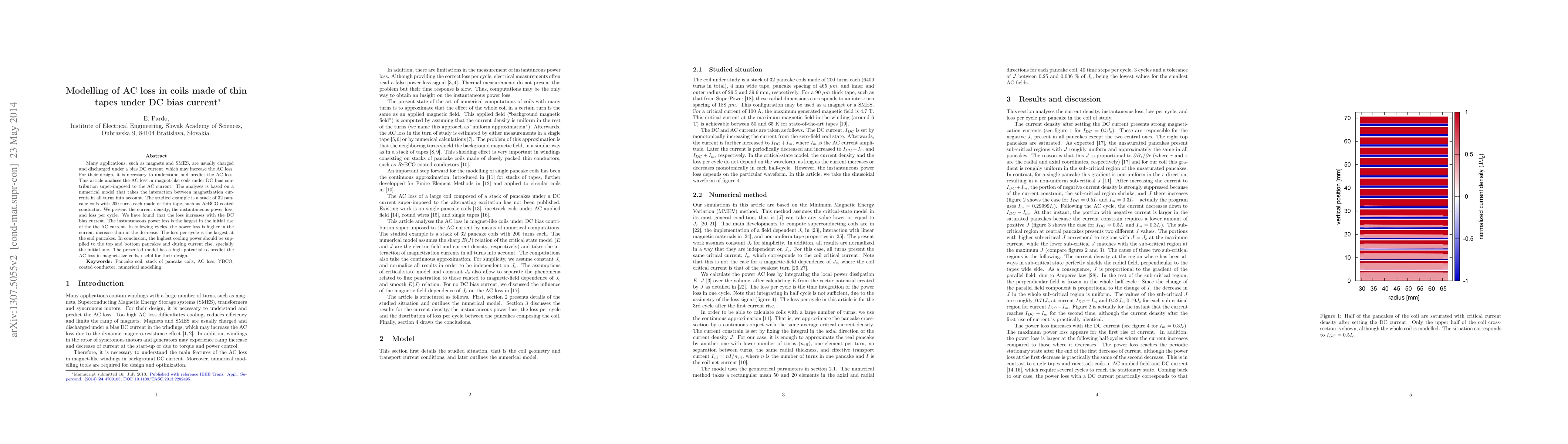 This paper models AC loss in coils made of thin tapes under a superimposed DC bias current, finding that AC loss increases with the DC bias. The study uses a numerical model to analyze a stack of 32 pancake coils, revealing that the highest cooling power should be supplied to the top and bottom coils during the initial rise of the AC current.