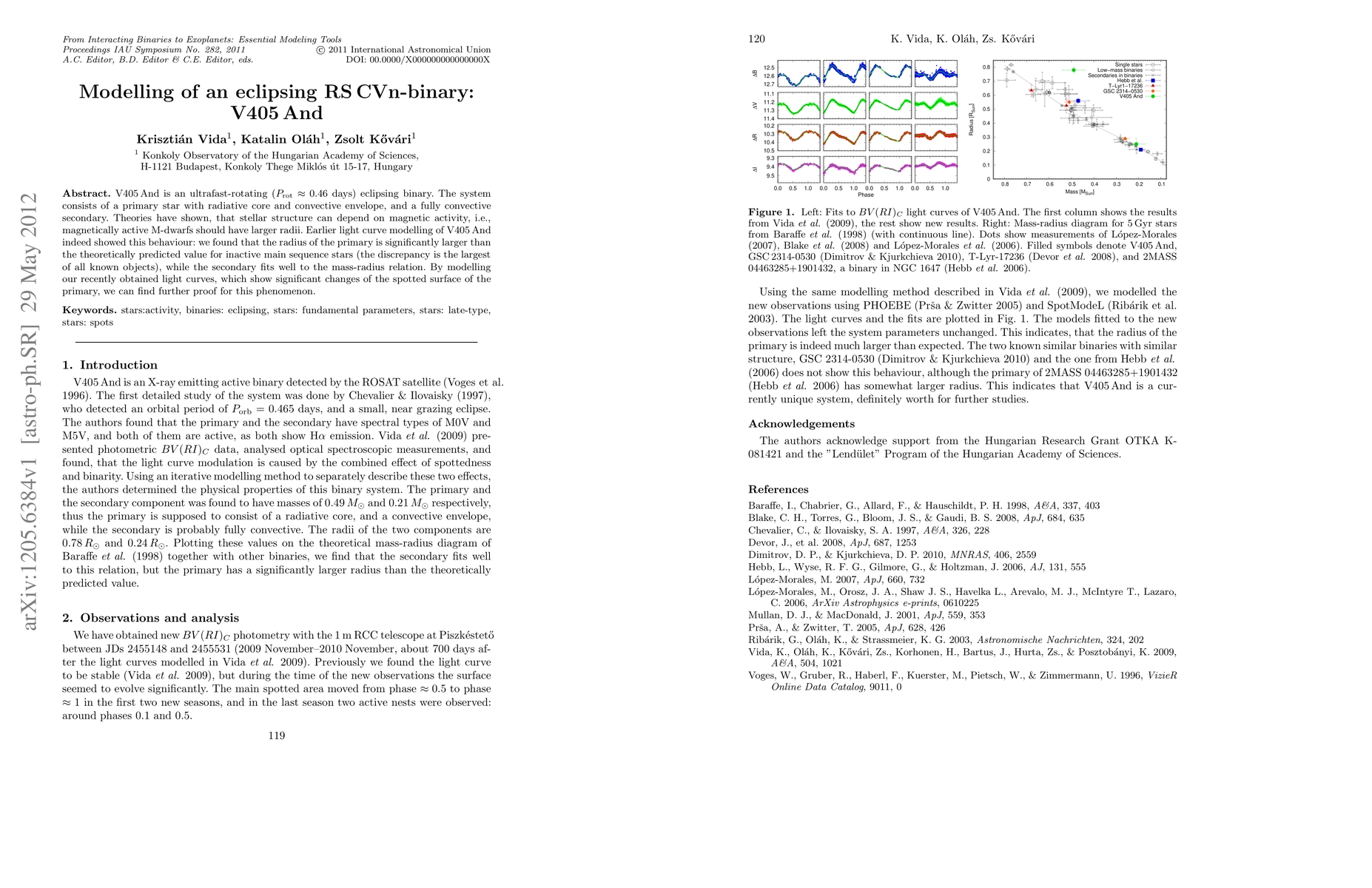 This paper models the eclipsing binary V405 And, revealing that the primary star's radius significantly exceeds theoretical predictions for inactive stars, suggesting a strong influence of magnetic activity. The secondary star's radius aligns with mass-radius relations, while recent light curves show the primary's spotted surface changes.