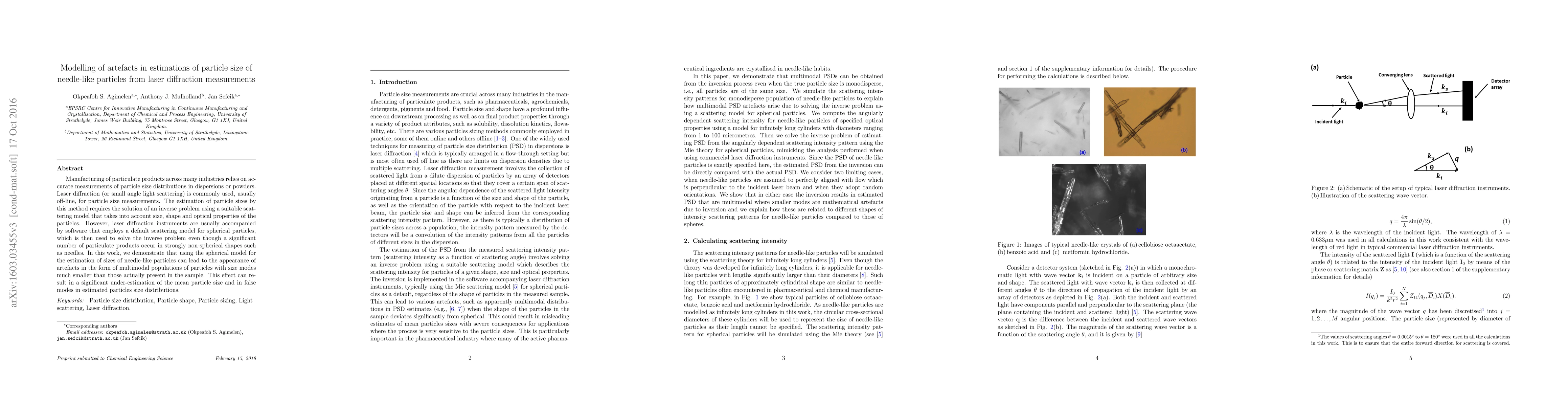 Manufacturing of particulate products across many industries relies on accurate measurements of particle size distributions in dispersions or powders. Laser diffraction (or small angle light scattering) is commonly used, usually off-line, for particle size measurements. The estimation of particle sizes by this method requires the solution of an inverse problem using a suitable scattering model that takes into account size, shape and optical properties of the particles. However, laser diffraction instruments are usually accompanied by software that employs a default scattering model for spherical particles, which is then used to solve the inverse problem even though a significant number of particulate products occur in strongly non-spherical shapes such as needles. In this work, we demonstrate that using the spherical model for the estimation of sizes of needle-like particles can lead to the appearance of artefacts in the form of multimodal populations of particles with size modes much smaller than those actually present in the sample. This effect can result in a significant under-estimation of the mean particle size and in false modes in estimated particles size distributions.