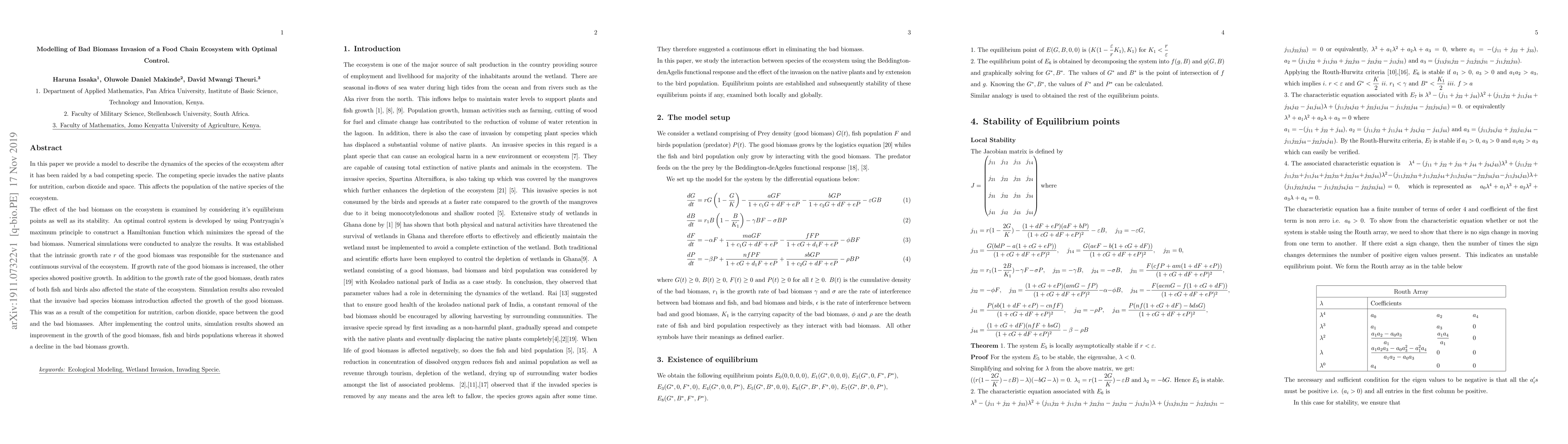 In this paper we provide a model to describe the dynamics of the species of the ecosystem after it has been raided by a bad competing specie. The competing specie invades the native plants for nutrition, carbon dioxide and space. This affects the population of the native species of the ecosystem. The effect of the bad biomass on the ecosystem is examined by considering it's equilibrium points as well as its stability. An optimal control system is developed by using Pontryagin's maximum principle to construct a Hamiltonian function which minimizes the spread of the bad biomass. Numerical simulations were conducted to analyze the results. It was established that the intrinsic growth rate r of the good biomass was responsible for the sustenance and continuous survival of the ecosystem. If growth rate of the good biomass is increased, the other species showed positive growth. In addition to the growth rate of the good biomass, death rates of both fish and birds also affected the state of the ecosystem. Simulation results also revealed that the invasive bad species biomass introduction affected the growth of the good biomass. This was as a result of the competition for nutrition, carbon dioxide, space between the good and the bad biomases. After implementing the control units, simulation results showed an improvement in the growth of the good biomass, fish and birds populations whereas it showed a decline in the bad biomass growth.