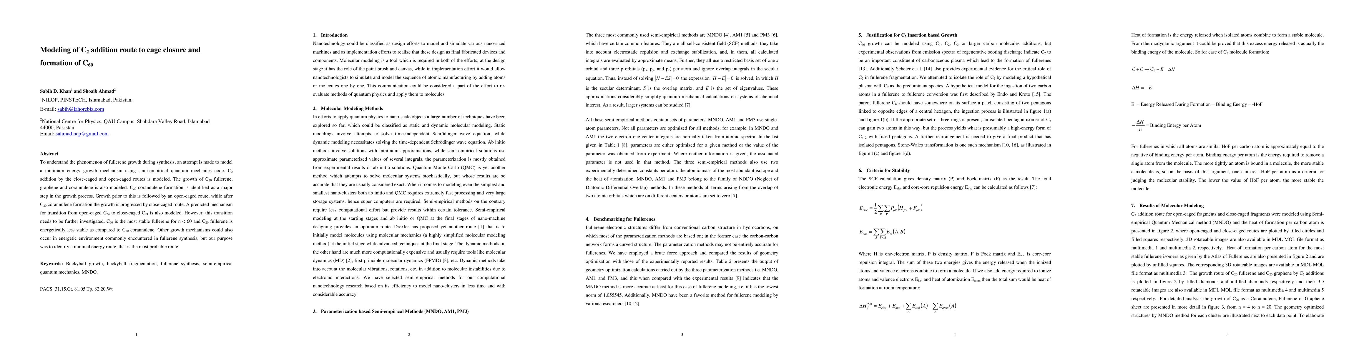 To understand the phenomenon of fullerene growth during its synthesis, an attempt is made to model a minimum energy growth route using a semi-empirical quantum mechanics code. C2 addition leading to C60 was modelled and three main routes, i.e. cyclic ring growth, pentagon and fullerene road, were studied. The growth starts with linear chains and, at n = 10, ring structures begins to dominate. The rings continue to grow and, at some point n > 30, they transform into close-cage fullerenes and the growth is shown to progress by the fullerene road until C60 is formed. The computer simulations predict a transition from a C38 ring to fullerene. Other growth mechanisms could also occur in the energetic environment commonly encountered in fullerene synthesis, but our purpose was to identify a minimal energy route which is the most probable structure. Our results also indicate that, at n = 20, the corannulene structure is energetically more stable than the corresponding fullerene and graphene sheet, however a ring structure has lower energy among all the structures up to n 6 40. Additionally, we have also proved that the fullerene road is energetically more favored than the pentagon road. The overall growth leading to cage closure for n = 60 may not occur by a single route but by a combination of more than one route.