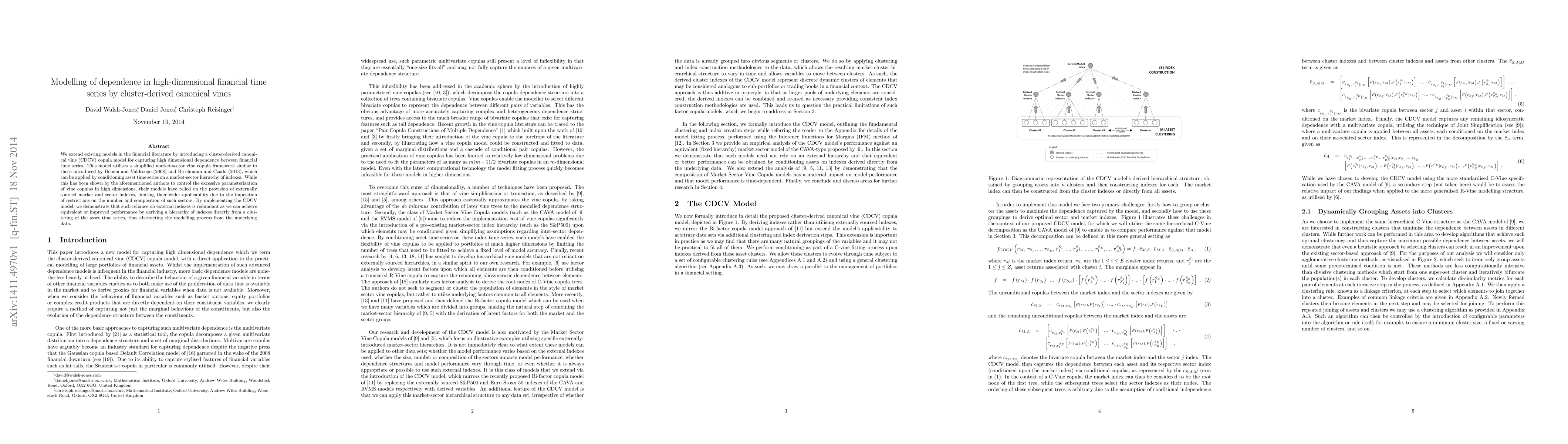 This paper introduces a cluster-derived canonical vine (CDCV) copula model to capture high-dimensional dependence in financial time series, eliminating the need for external market-sector indexes. The CDCV model simplifies vine copula frameworks by deriving a market-sector hierarchy directly from asset time series clustering, enhancing model flexibility and performance.