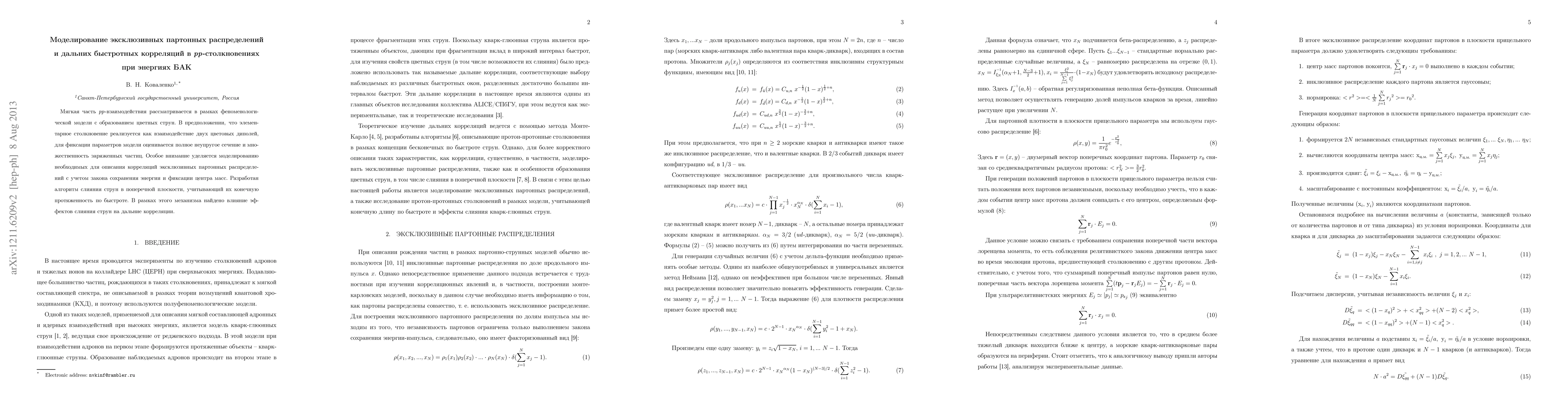 Soft pp interactions are considered in the framework of the phenomenological model with color strings formation. Under the assumption, that the elementary collision is realized as interaction of two color dipoles, the total inelastic cross section and the multiplicity of the charged particles are estimated and used for the parameters fixing. The special attention is given to the modelling of exclusive parton distributions taking into account the energy conservation and fixing the mass center that is necessary for the description of correlations, corresponding Monte Carlo procedures are developed for an arbitrary number of partons in a hadron. The string fusion algorithm in a cross-section plane is developed taking into account the finite rapidity width of strings. In this framework the influence of string fusion effects on long-range correlations of charged particles are estimated. The proposed algorithms are planned to be used for studying of heavy ion collisions.