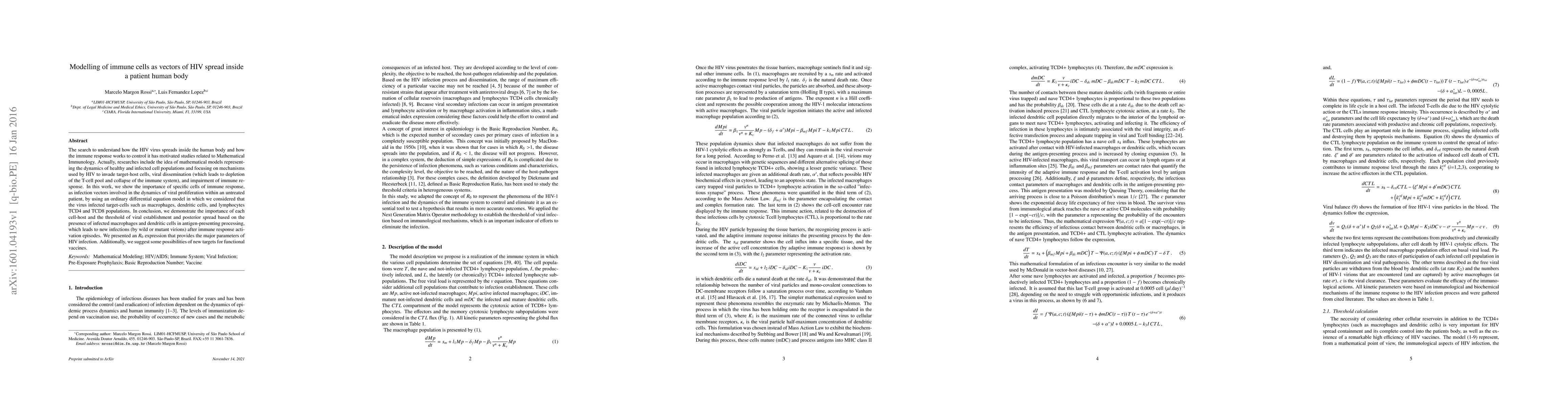 The search to understand how the HIV virus spreads inside the human body and how the immune response works to control it has motivated studies related to Mathematical Immunology. Actually, researches include the idea of mathematical models representing the dynamics of healthy and infected cell populations and focusing on mechanisms used by HIV to invade target-host cells, viral dissemination (which leads to depletion of the T-cell pool and collapse of the immune system), and impairment of immune response. In this work, we show the importance of specific cells of immune response, as infection vectors involved in the dynamics of viral proliferation within an untreated patient, by using an ordinary differential equation model in which we considered that the virus infected target-cells such as macrophages, dendritic cells, and lymphocytes TCD4 and TCD8 populations. In conclusion, we demonstrate the importance of each cell-host and the threshold of viral establishment and posterior spread based on the presence of infected macrophages and dendritic cells in antigen-presenting processing, which leads to new infections (by wild or mutant virions) after immune response activation episodes. We presented an $R_0$ expression that provides the major parameters of HIV infection. Additionally, we suggest some possibilities of new targets for functional vaccines.