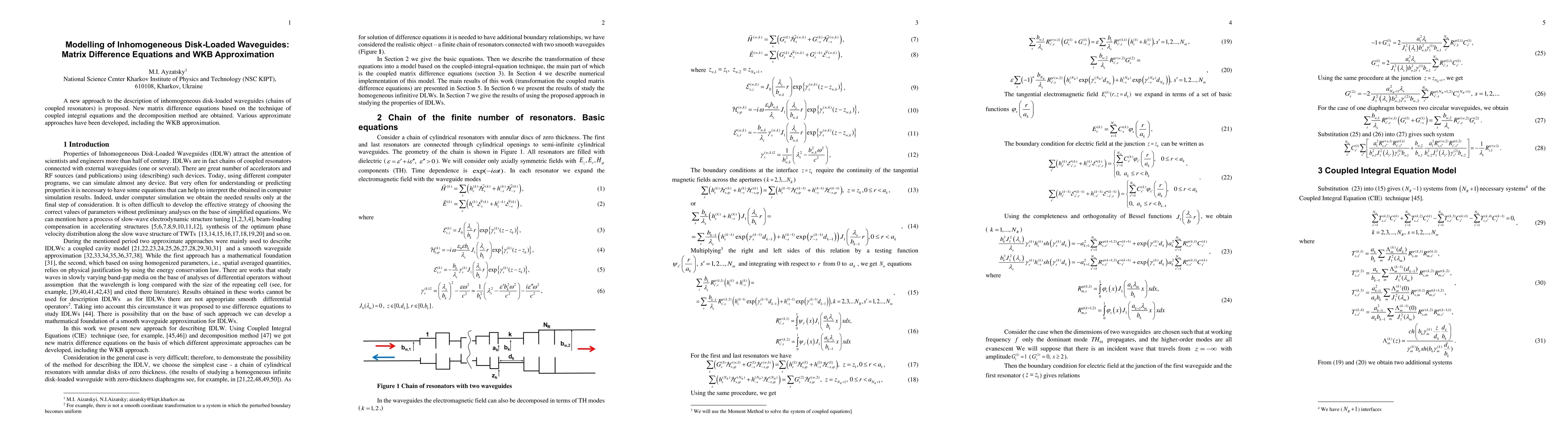 A new approach to the description of inhomogeneous disk-loaded waveguides (chains of coupled resonators) is proposed. New matrix difference equations based on the technique of coupled integral equations and the decomposition method are obtained. Various approximate approaches have been developed, including the WKB approximation.