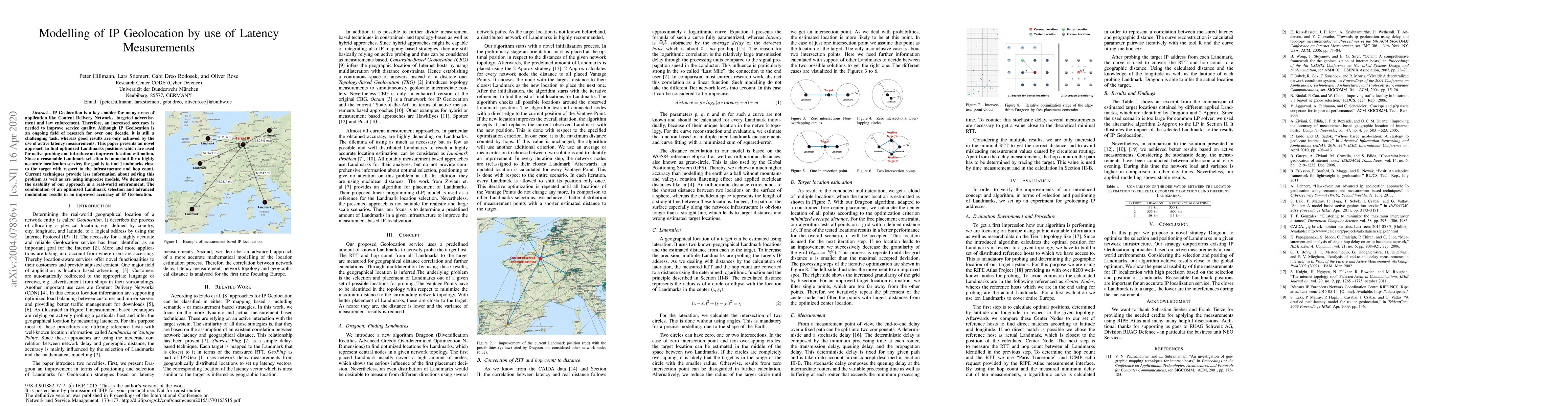 IP Geolocation is a key enabler for many areas of application like Content Delivery Networks, targeted advertisement and law enforcement. Therefore, an increased accuracy is needed to improve service quality. Although IP Geolocation is an ongoing field of research for over one decade, it is still a challenging task, whereas good results are only achieved by the use of active latency measurements. This paper presents an novel approach to find optimized Landmarks positions which are used for active probing and introduce an improved location estimation. Since a reasonable Landmark selection is important for a highly accurate localization service, the goal is to find Landmarks close to the target with respect to the infrastructure and hop count. Current techniques provide less information about solving this problem as well as are using imprecise models. We demonstrate the usability of our approach in a real-world environment. The combination of an optimized Landmark selection and advanced modulation results in an improved accuracy of IP Geolocation.