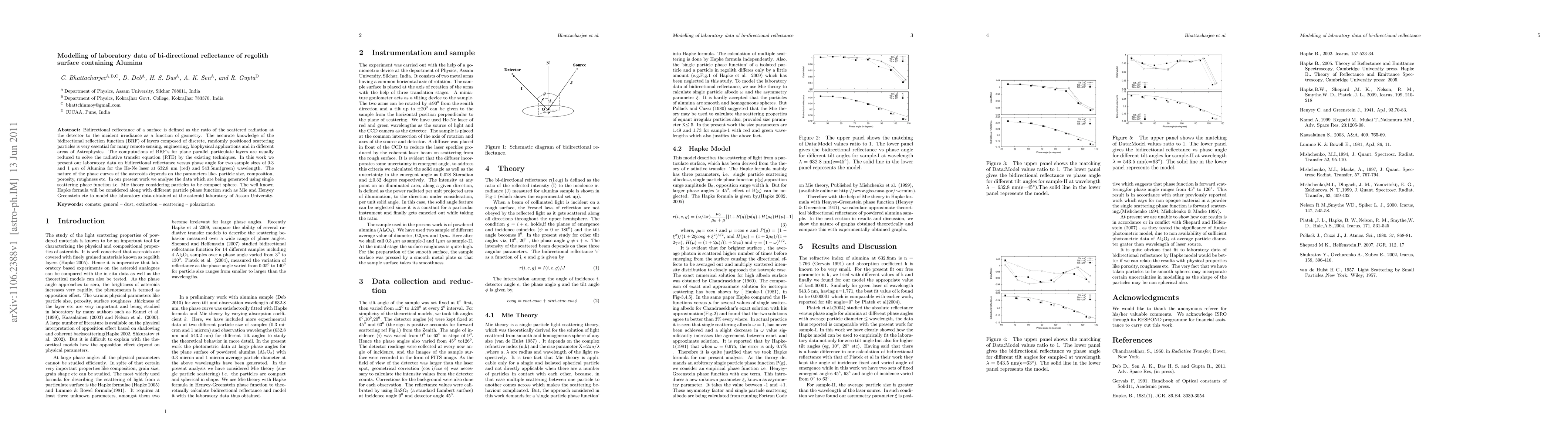 Bidirectional reflectance of a surface is defined as the ratio of the scattered radiation at the detector to the incident irradiance as a function of geometry. The accurate knowledge of the bidirectional reflection function (BRF) of layers composed of discrete, randomly positioned scattering particles is very essential for many remote sensing, engineering, biophysical applications and in different areas of Astrophysics. The computations of BRF's for plane parallel particulate layers are usually reduced to solve the radiative transfer equation (RTE) by the existing techniques. In this work we present our laboratory data on bidirectional reflectance versus phase angle for two sample sizes of 0.3 and 1 $\mu m$ of Alumina for the He-Ne laser at 632.8 nm (red) and 543.5nm(green) wavelength. The nature of the phase curves of the asteroids depends on the parameters like- particle size, composition, porosity, roughness etc. In our present work we analyse the data which are being generated using single scattering phase function i.e. Mie theory considering particles to be compact sphere. The well known Hapke formula will be considered along with different particle phase function such as Mie and Henyey Greenstein etc to model the laboratory data obtained at the asteroid laboratory of Assam University.