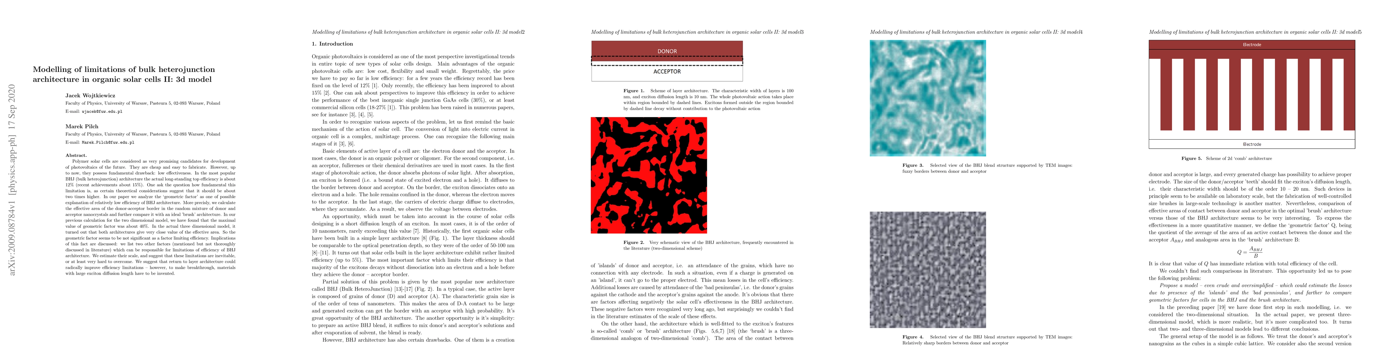 Polymer solar cells are considered as very promising candidates for development of photovoltaics of the future. They are cheap and easy to fabricate. However, up to now, they possess fundamental drawback: low effectiveness. In the most popular BHJ (bulk heterojunction) architecture the actual long-standing top efficiency is about 12\% (recent achievements about 15\%). One ask the question how fundamental this limitation is, as certain theoretical considerations suggest that it should be about two times higher. In our paper we analyze the `geometric factor' as one of possible explanation of relatively low efficiency of BHJ architecture. More precisly, we calculate the effective area of the donor-acceptor border in the random mixture of donor and acceptor nanocrystals and further compare it with an ideal 'brush' architecture. In our previous calculation for the two dimensional model, we have found that the maximal value of geometric factor was about 40\%. In the actual three dimensional model, it turned out that both architectures give very close value of the effective area. So the geometric factor seems to be not significant as a factor limiting efficiency. Implications of this fact are discussed: we list two other factors (mentioned but not thoroughly discussed in literature) which can be responsible for limitations of efficiency of BHJ architecture. We estimate their scale, and suggest that these limitations are inevitable, or at least very hard to overcome. We suggest that return to layer architecture could radically improve efficiency limitations -- however, to make breakthrough, materials with large exciton diffusion length have to be invented.