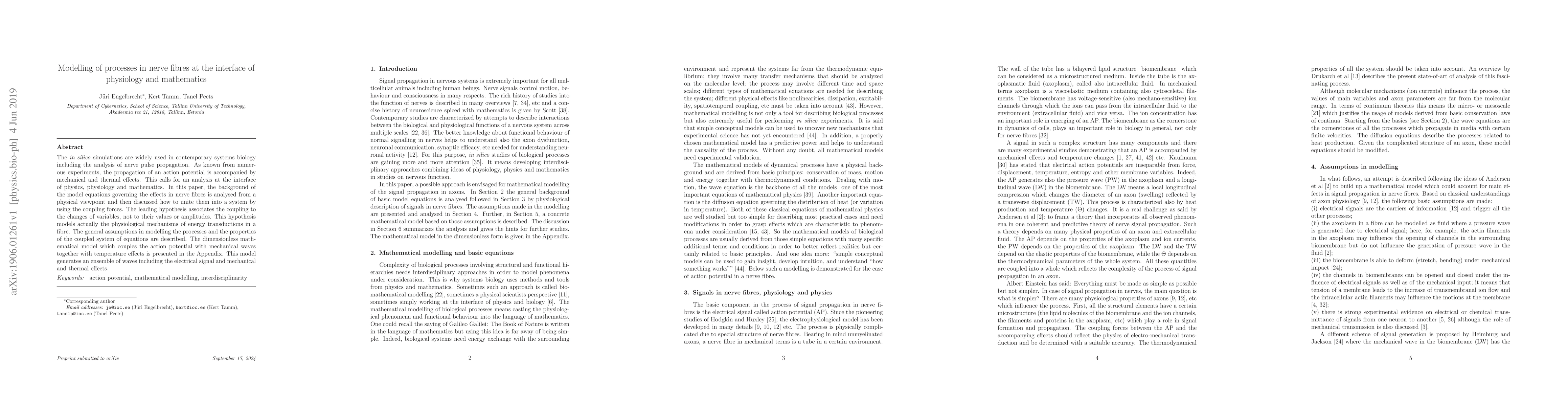 The in silico simulations are widely used in contemporary systems biology including the analysis of nerve pulse propagation. As known from numerous experiments, the propagation of an action potential is accompanied by mechanical and thermal effects. This calls for an analysis at the interface of physics, physiology and mathematics. In this paper, the background of the model equations governing the effects in nerve fibres is analysed from a physical viewpoint and then discussed how to unite them into a system by using the coupling forces. The leading hypothesis associates the coupling to the changes of variables, not to their values or amplitudes. This hypothesis models actually the physiological mechanisms of energy transductions in a fibre. The general assumptions in modelling the processes and the properties of the coupled system of equations are described. The dimensionless mathematical model which couples the action potential with mechanical waves together with temperature effects is presented in the Appendix. This model generates an ensemble of waves including the electrical signal and mechanical and thermal effects.